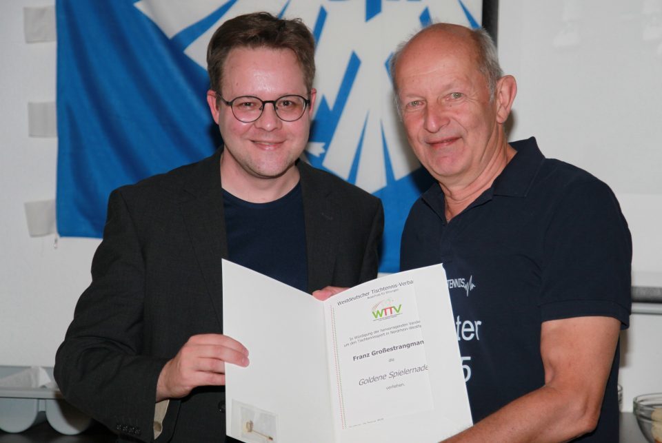 Anschließend gratulierte der ehemalige Kreisvorsitzende Thorsten Mönning im Namen des Bezirkes Ostwestfalen-Nord und lobte auch ganz besonders die DJK für ihren enormen Einsatz für den TT-Sport. Im Auftrage des WTTV durfte er dann auch drei seit vielen Jahren aktive TT-Sportler mit Urkunde und Verdienstnadel auszeichnen. Während Ingo Schmiljun und Sven Kuhlmann mit der „ Bronzenen Spielernadel“ des WTTV geehrt wurden, erhielt mit Franz Großestrangmann ein echtes „Urgestein“ der DJK die „Goldene Spielernadel“. Franz Großestrangmann ist ist seit über 50 Jahren aktiv und hat nie den Verein gewechselt. Über viele Jahre war er die Nr. 1 der 1. Herren-Mannschaft und auch auf Kreisebene gehörte er zu den stärksten Spielern. So gewann er bei den Kreismeisterschaften den Titel in der Hauptklasse der Herren und einige Jahre später auch bei den Senioren. Durch seine überaus freundliche und faire Einstellung ist Franz Großestrangmann bei den TT-Sportlern sehr beliebt.