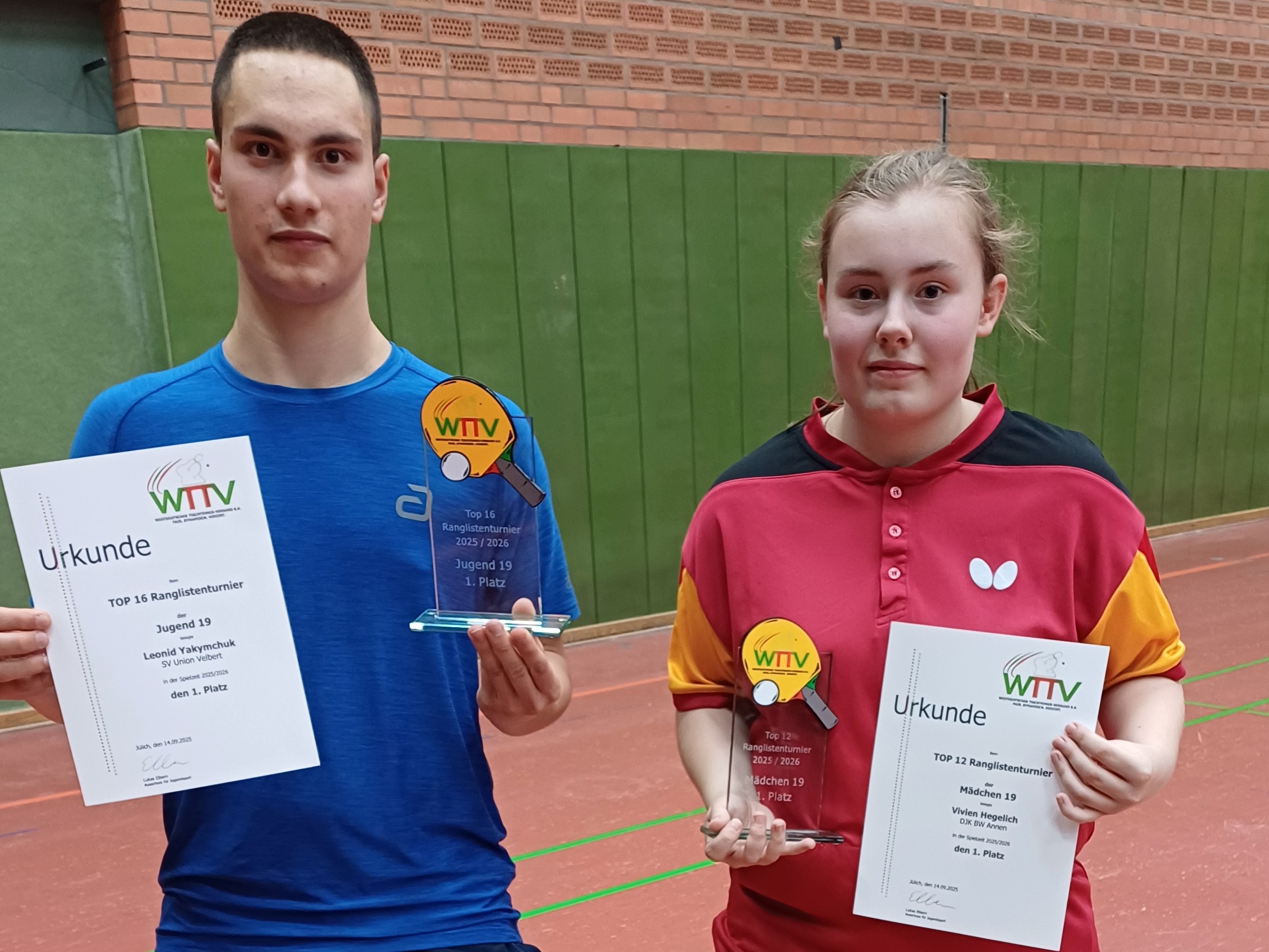 Am 14. September 2025 fand in der Halle des traditionsreichen TTC indeland Jülich die Endrangliste Top16/12 der Mädchen und Jungen 19 statt. Bei den Mädchen gab es einen doch in der Souveränität erzielten Sieg von Vivien Hegerich (DJK BW Annen), die erst gegen Ende des Turniers gegen die spätere