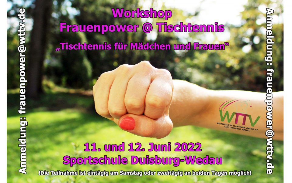 Bald ist es soweit, am 11. und 12. Juni 2022 findet in der Sportschule Duisburg-Wedau unser Workshop „Frauenpower @ Tischtennis“ statt. Wir freuen uns schon sehr darauf, Ideen zu entwickeln, wie wir den Tischtennissport für Mädchen und Frauen in den nächsten Jahren attraktiver gestalten können.
