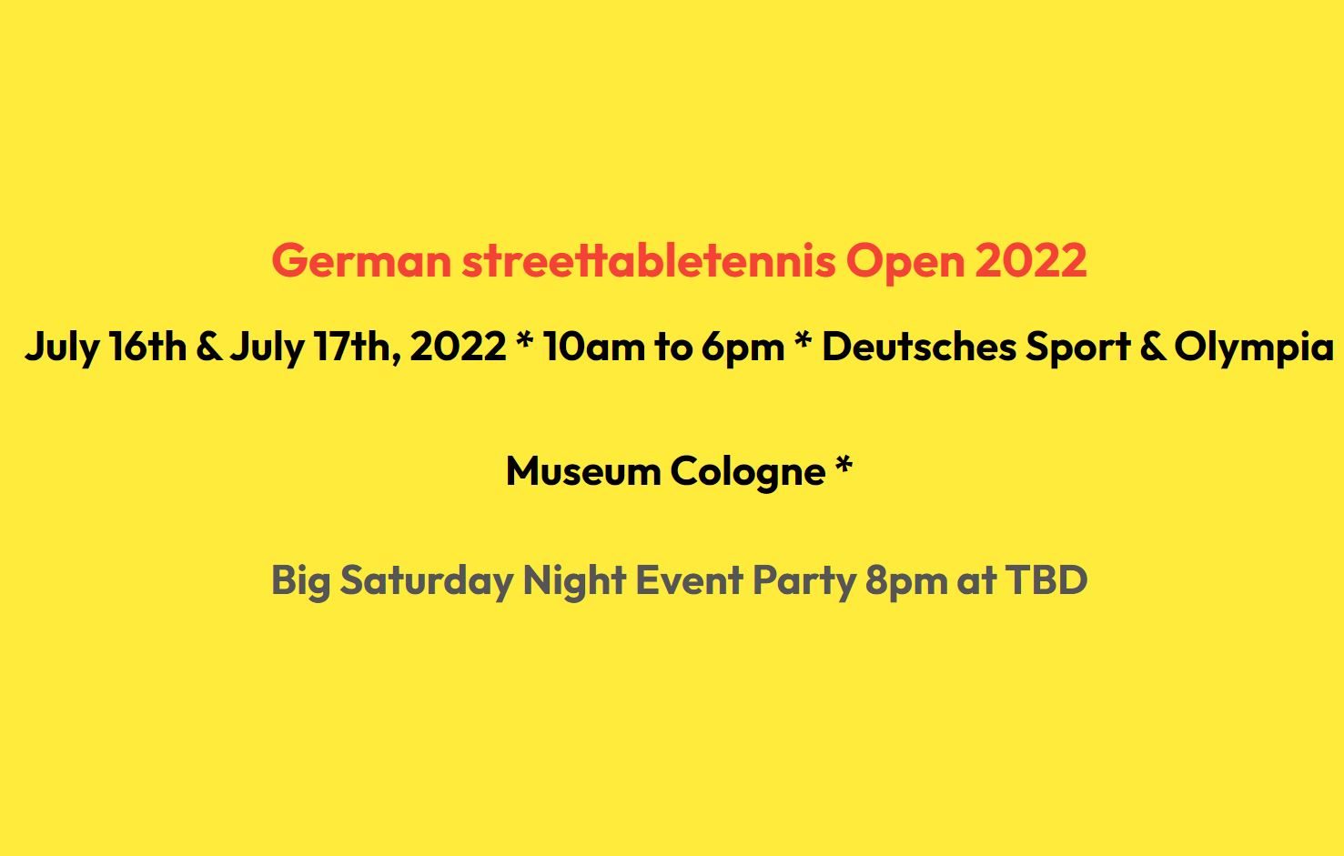 Vom 16.7.-17.7.2022 finden die GERMAN STREETTABLETENNIS OPEN 2022 in Köln statt! Die Organisatoren von Streettabletennis haben hierfür 128 Starterplätze eingerichtet. Das Event wird auf dem Dach des Deutschen Sport & … Weiterlesen