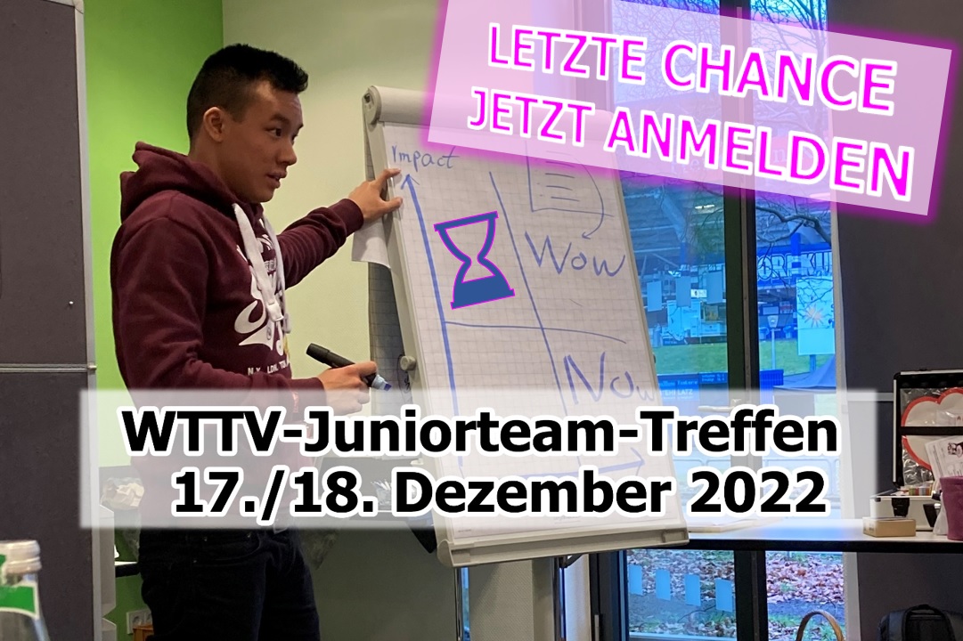 Am 17. und 18. Dezember findet das nächste WTTV-Juniorteam-Treffen für Jugendliche und junge Erwachsene im Alter von 14 bis 26 Jahren statt. Neben den Bildungsschwerpunkten „Projektmanagement“ und „Maßnahmen der außersportlichen … Weiterlesen