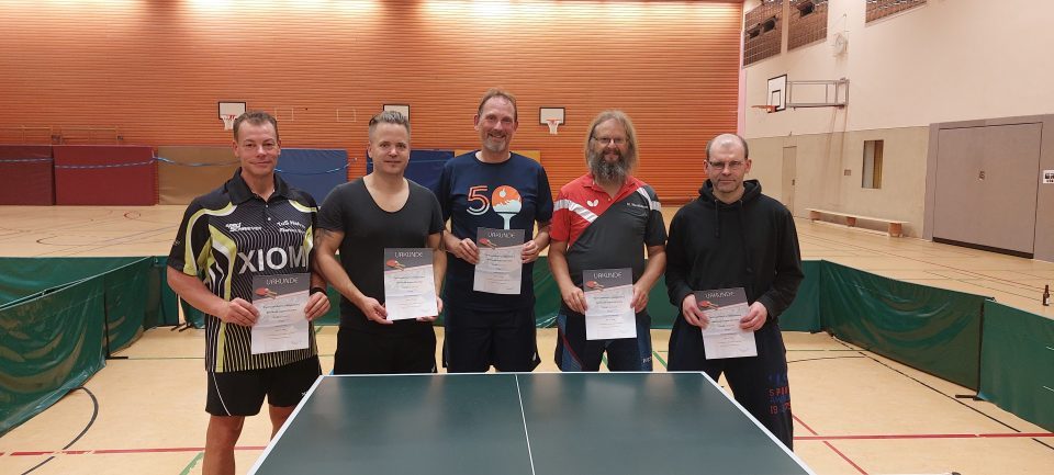 Ein echter Krimi bei der Bezirksendrangliste der Senioren 40, die am 04.09.23 in Lüdenscheid ausgetragen wurde, allerdings getrübt durch zwei krankheitsbedingte Ausfälle von Uwe Lenke (TTSG Lüdenscheid) und Daniel Sparding (TuS Halver). Am Ende standen mit Arnd Katzke (TTSG Lüdenscheid), Markus Born und Martin Werthmann (beide TuS Halver) drei Akteure mit gleicher Punktdifferenz auf dem Siegertreppchen. Entschieden wurde die Platzverteilung zunächst mit der Satzdifferenz. Martin Werthmann mit der schlechtesten Satzdifferenz belegte Platz drei. Katzke und Born hatten die gleiche Satzdifferenz, so dass am Ende die Bälle gezählt werden mussten. 11 Bälle besser war Arnd Katzke der damit der Gewinner der Bezirksendrangliste 40 vor Markus Born war. Platz 4 belegte Marc Bewernick (TuS Bierbaum) vor Thomas Hoffmann (TTG Netphen).