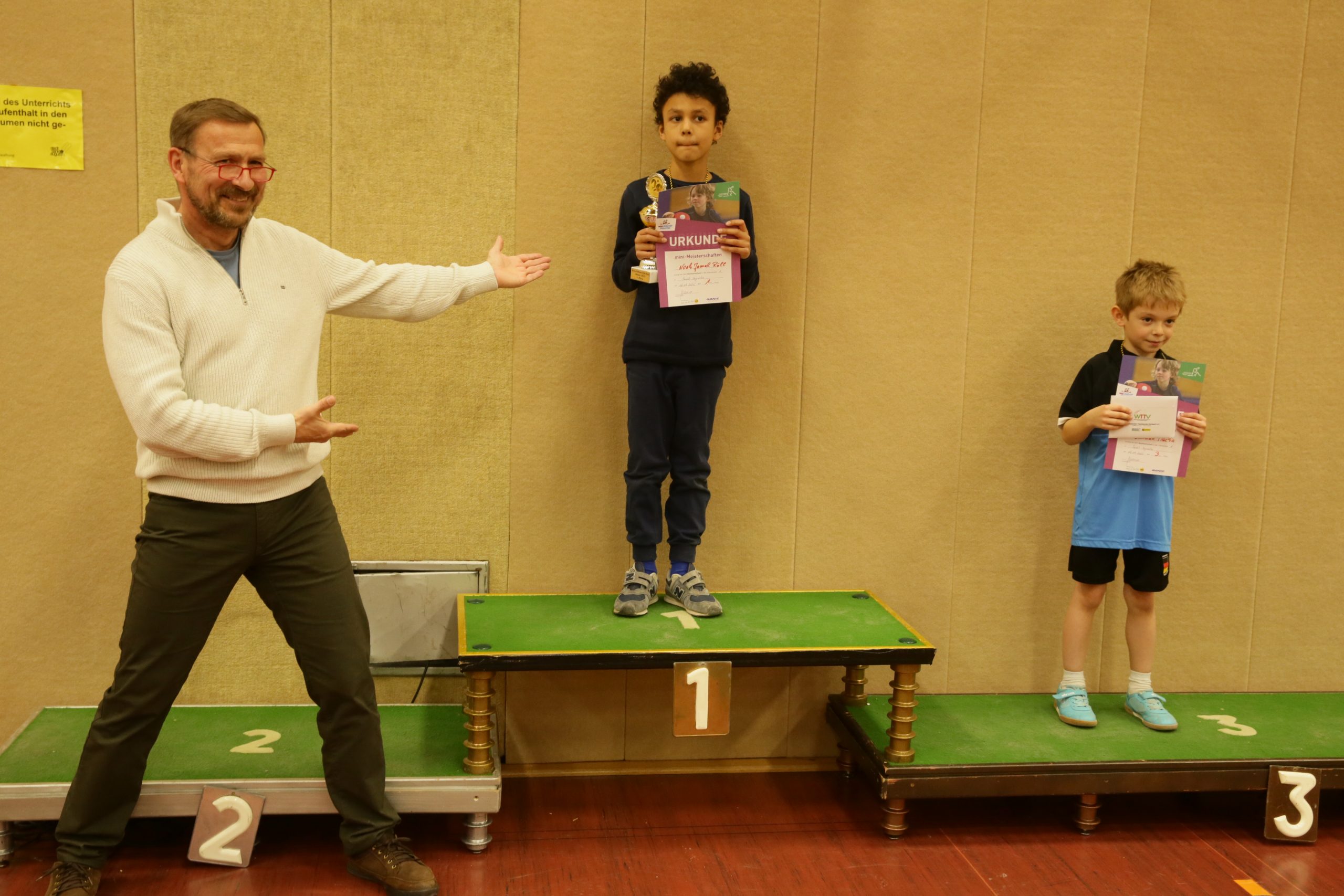 Pünktlich um 14:00 Uhr konnten Johannes Heinzen und Dr. Max Leittersdorf, Bürgermeister der Stadt Sankt Augustin, die Teilnehmer:innen und ihre Eltern begrüßen. Aufgrund einiger unerwarteter Nachmeldungen starteten zunächst nur die Mädchen und die Jungen bis 8 Jahre, denn die Gruppen der übrigen Klassen mussten neu ausgelost werden. Hier gebührt dem Bezirkssportwart Oliver Schwesig als durchführendem Administrator des Turniers Dank und Anerkennung, dass er diese Herausforderung im Parallelbetrieb bewältigen konnte. Mit einer Verzögerung von einer Stunde konnten dann auch die älteren Jungenklassen starten und einem reibungslosen Turnierverlauf stand nichts mehr im Weg.