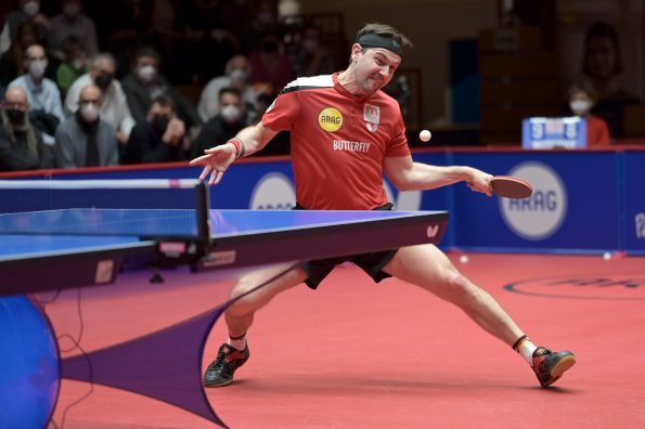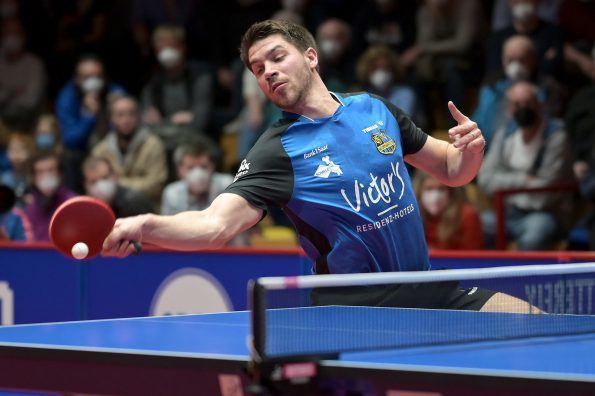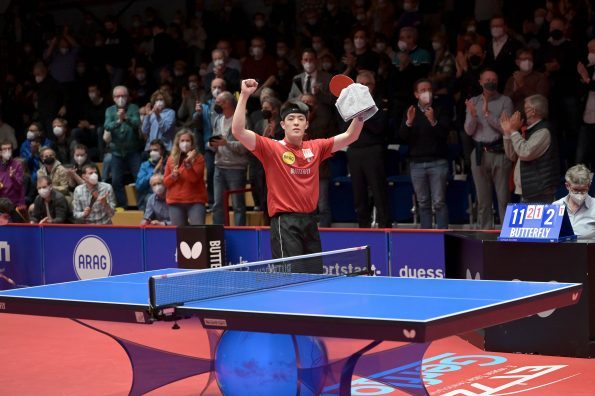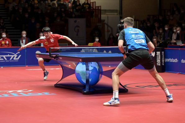 Am vergangenen Donnerstag, 03.03.2022 trafen sich zum Rückspiel in der TTCL Borussia Düsseldorf und der 1. FC Saarbrücken TT im ARAG CenterCourt. Kurz vor Beginn der Partie hat die ETTU beschlossen, die Mannschaften aus Russland mit sofortiger Wirkung von allen Wettbewerben der Saison 2021/22 auszuschließen. So wurde aus einem Rückspiel ein echtes Endspiel. Das Hinspiel hatten die Rheinländer mit 3:0 in Saarrücken gewonnen und somit eine hervorragende Ausgangsposition geschaffen. Im ersten Spiel des Abends trafen Dang Qiu und Darko Jorgic aufeinander. Jorgic war der Favorit, da er wenige Tage zuvor das Europe TOP 16 Turnier gewinnen konnte. Jedoch hat Qiu wieder einmal seine beeindruckende Form unter Beweis gestellt. In einem hochklassigen Spiel nutze er seine Chancen und gewann das Match und brachte somit die Borussen in Führung.