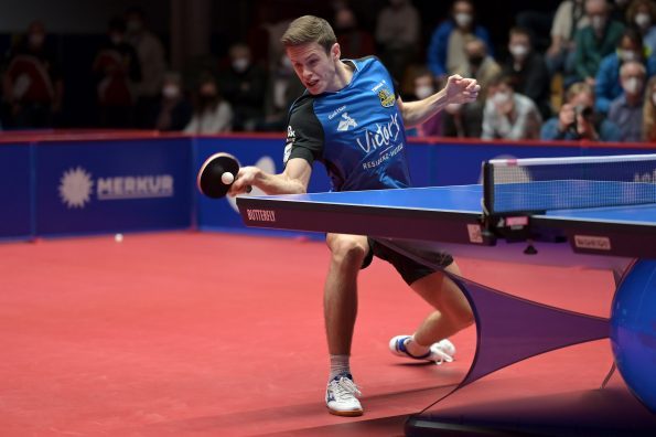 In der zweiten Begegnung des Abends trafen die deutschen Nationalspieler Timo Boll und Patrick Franziska aufeinander. Ein Feuerwerk von exzellenten Ballwechseln konnten die knapp 700 Zuschauer (Corona bedingt durften nicht mehr in die Halle) bestaunen. Boll und Franziska schenkten sich nichts und so musste die Entscheidung im verkürzten fünften Satz fallen. Hier konnte Franziska mit sehr guten Platzierungen punkten und gewann den Satz mit 6:2 und hielt seine Mannschaft im Spiel.