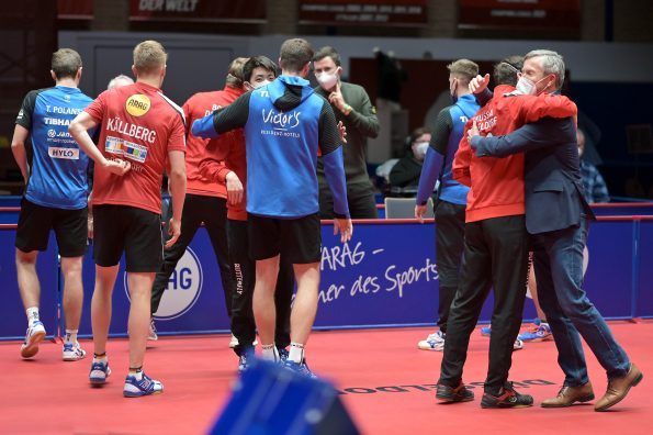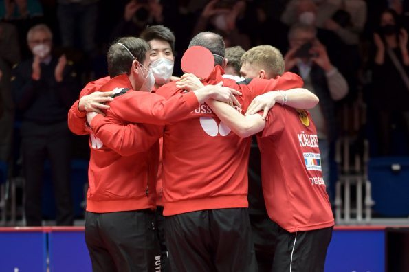 Nach der Pause gingen Anton Källberg und Tomas Polansky in die Box. Der Borusse wusste, dass er mit einem Sieg die Titelverteidigung perfekt machen konnte. Källberg, der eine sensationelle Saison in der TTBL spielt, war an diesem Abend nicht zu stoppen. Als er im vierten Satz den Matchball verwandelte, gab es kein halten mehr in Düsseldorfer. Alle Spieler und Funktionäre sprangen auf und stürmten in die Box, um Källberg zu gratulieren und sich für den Erfolg in der Champions League von den Zuschauern feiern zu lassen.