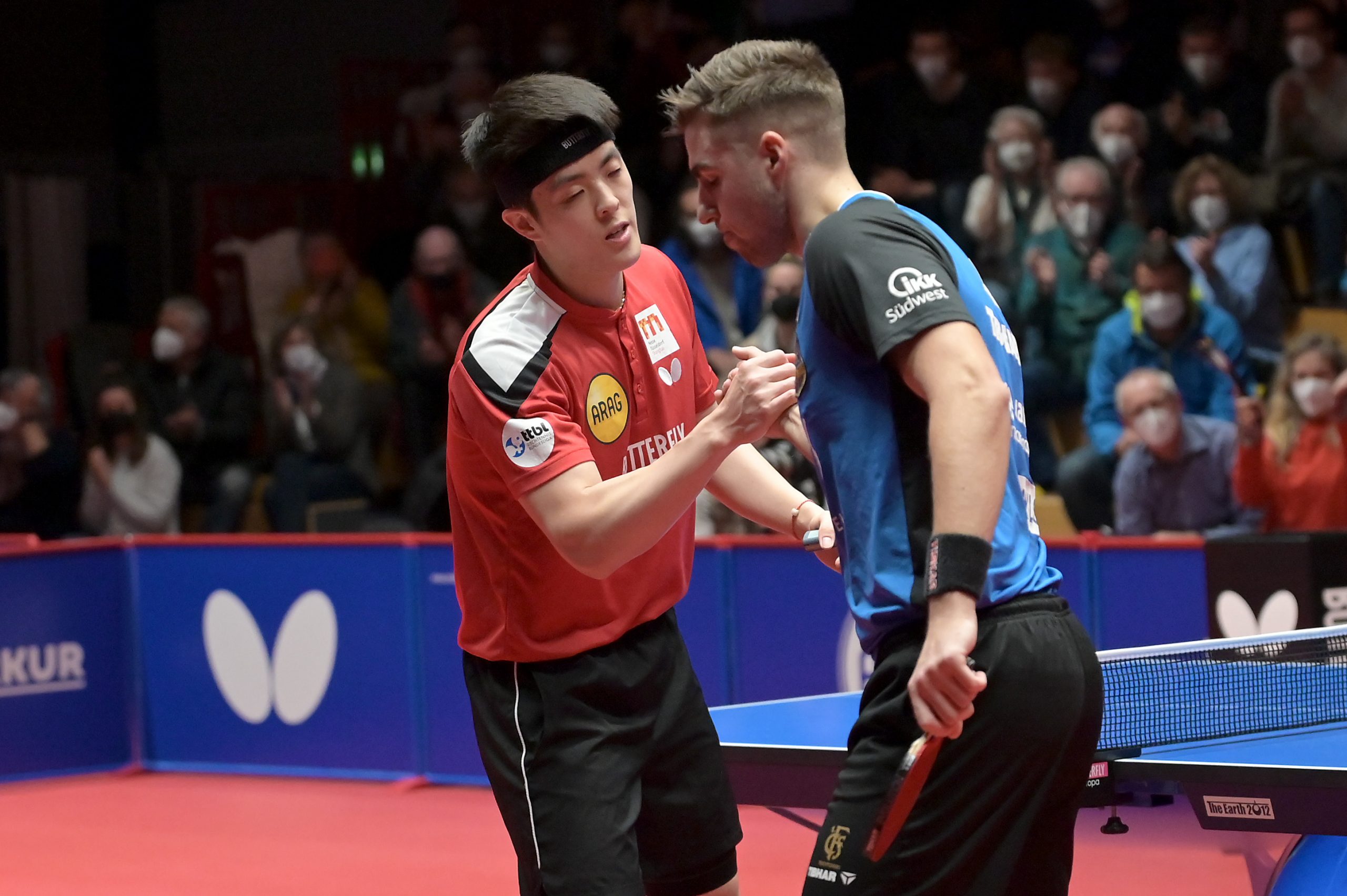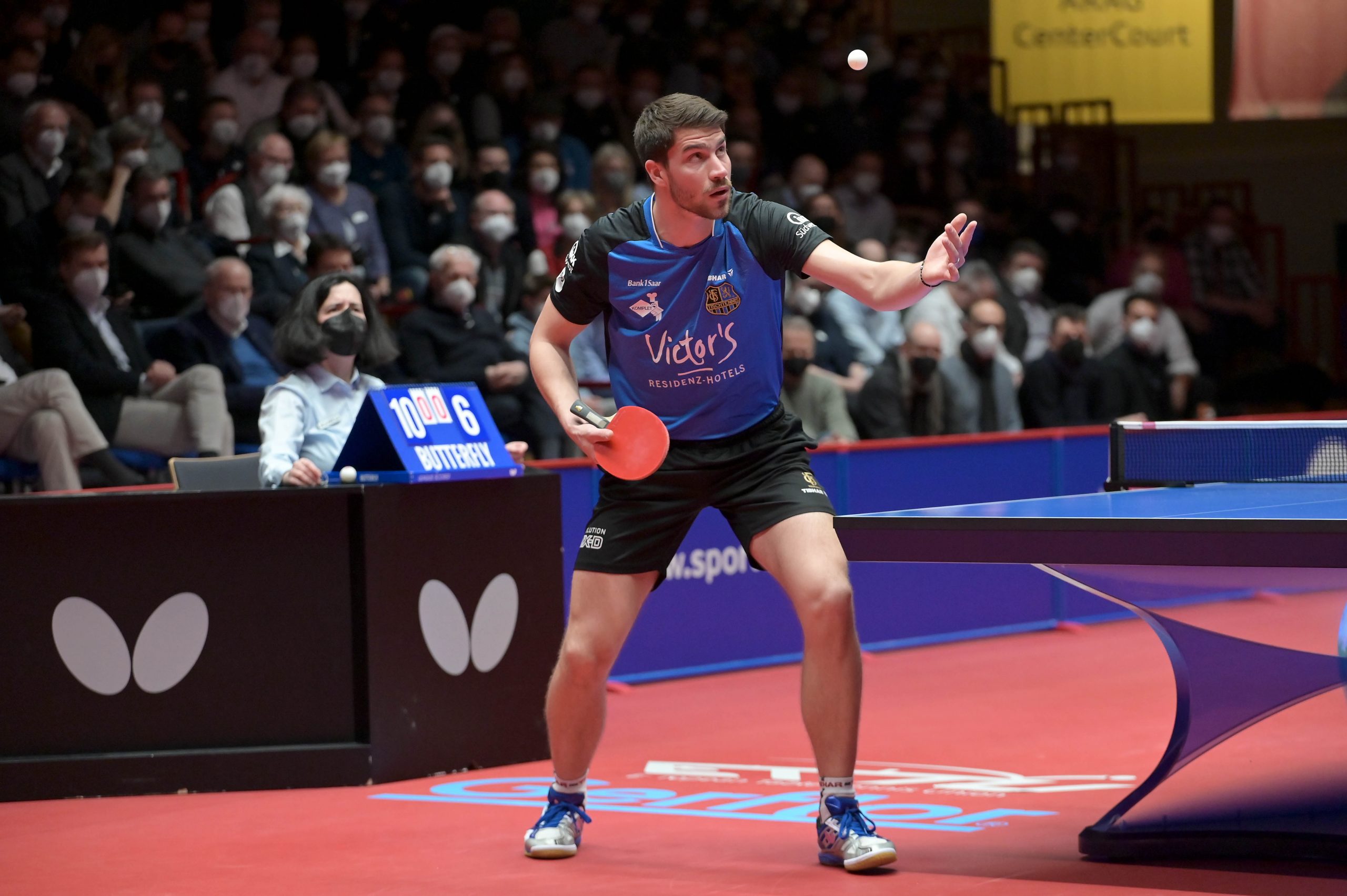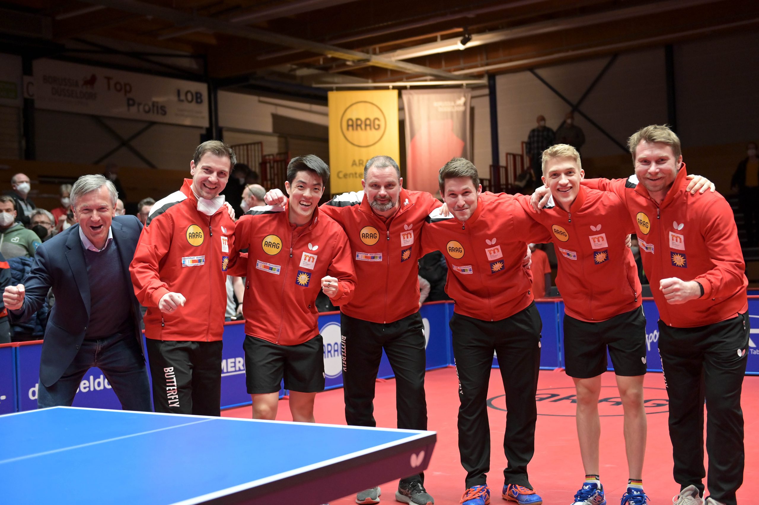 Am vergangenen Donnerstag, 03.03.2022 trafen sich zum Rückspiel in der TTCL Borussia Düsseldorf und der 1. FC Saarbrücken TT im ARAG CenterCourt. Kurz vor Beginn der Partie hat die ETTU beschlossen, die Mannschaften aus Russland mit sofortiger Wirkung von allen Wettbewerben der Saison 2021/22 auszuschließen. So wurde aus einem Rückspiel ein echtes Endspiel. Das Hinspiel hatten die Rheinländer mit 3:0 in Saarrücken gewonnen und somit eine hervorragende Ausgangsposition geschaffen. Im ersten Spiel des Abends trafen Dang Qiu und Darko Jorgic aufeinander. Jorgic war der Favorit, da er wenige Tage zuvor das Europe TOP 16 Turnier gewinnen konnte. Jedoch hat Qiu wieder einmal seine beeindruckende Form unter Beweis gestellt. In einem hochklassigen Spiel nutze er seine Chancen und gewann das Match und brachte somit die Borussen in Führung.
