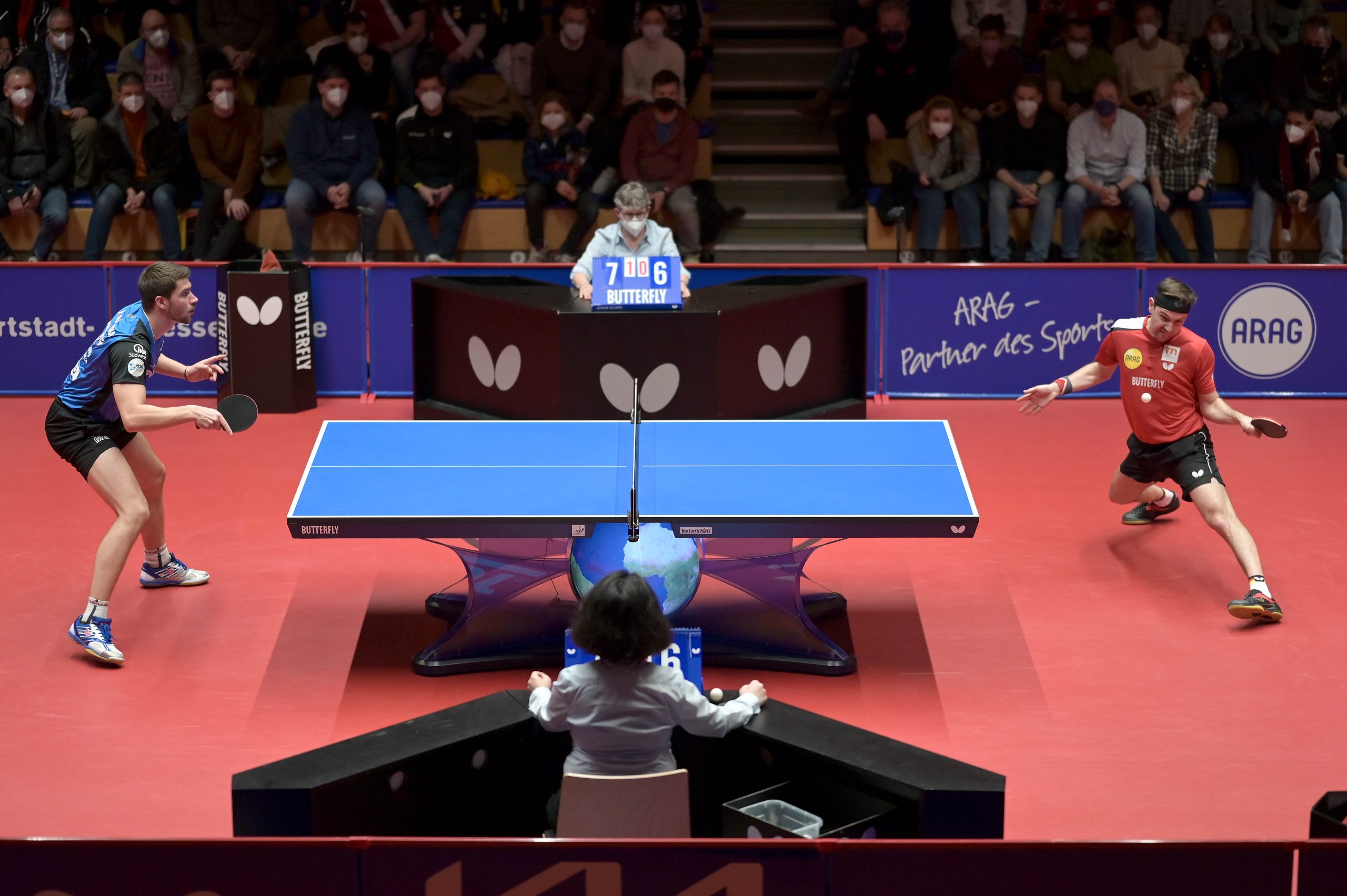 In der zweiten Begegnung des Abends trafen die deutschen Nationalspieler Timo Boll und Patrick Franziska aufeinander. Ein Feuerwerk von exzellenten Ballwechseln konnten die knapp 700 Zuschauer (Corona bedingt durften nicht mehr in die Halle) bestaunen. Boll und Franziska schenkten sich nichts und so musste die Entscheidung im verkürzten fünften Satz fallen. Hier konnte Franziska mit sehr guten Platzierungen punkten und gewann den Satz mit 6:2 und hielt seine Mannschaft im Spiel.