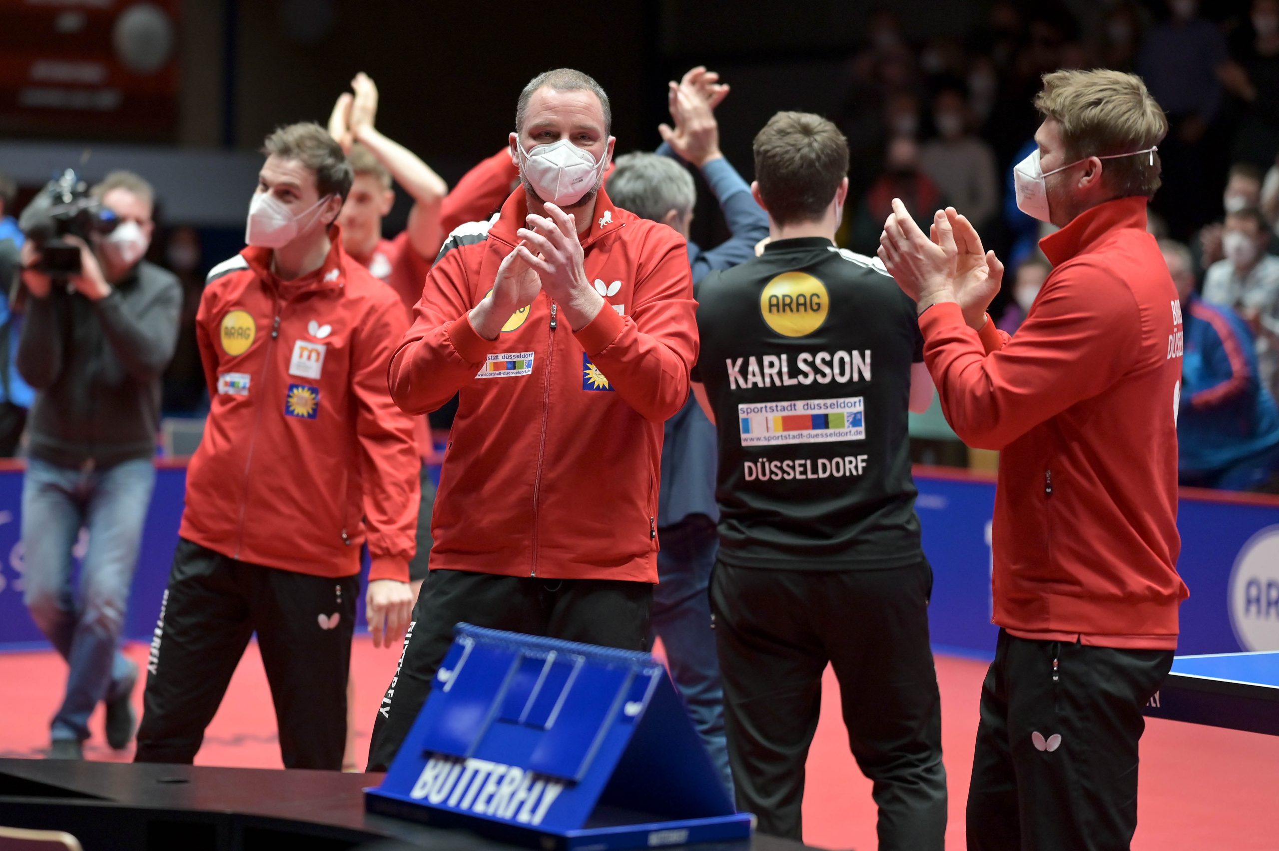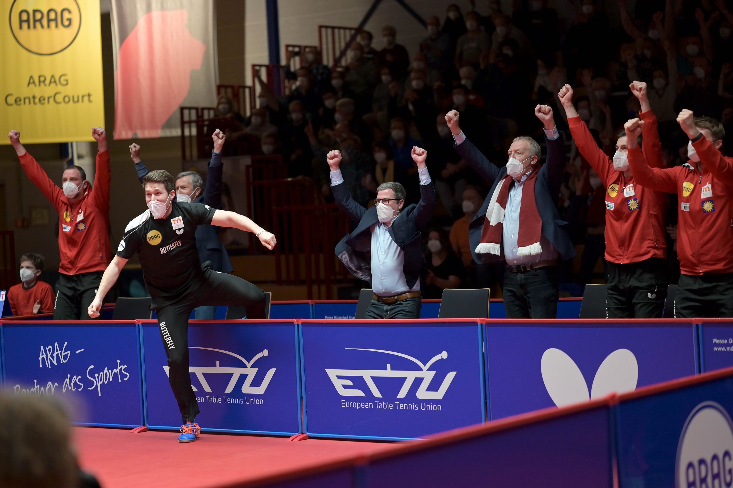 Nach der Pause gingen Anton Källberg und Tomas Polansky in die Box. Der Borusse wusste, dass er mit einem Sieg die Titelverteidigung perfekt machen konnte. Källberg, der eine sensationelle Saison in der TTBL spielt, war an diesem Abend nicht zu stoppen. Als er im vierten Satz den Matchball verwandelte, gab es kein halten mehr in Düsseldorfer. Alle Spieler und Funktionäre sprangen auf und stürmten in die Box, um Källberg zu gratulieren und sich für den Erfolg in der Champions League von den Zuschauern feiern zu lassen.