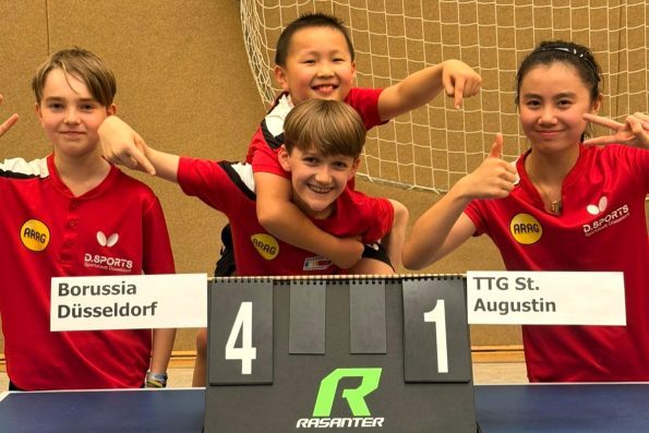 Das Jungen-Team, mit Matthias Jax, Elias Plötzke und Luka He wurde mit Emma Li komplettiert, gewann in der Vorrunde souverän gegen Franz-Sales-Haus Essen mit 4:0 und 4:1 gegen TSVE Bielefeld und traf im Finale auf die TTG St. Augustin (mit Max Mathes, Thanh Binh Nguyen und Moritz Faß), die ebenfalls durch zwei sichere Siege gegen Salzkotten und Nievenheim ins Endspiel einzogen. Die Borussia konnte sich am Ende mit 4:1 durchsetzen, aber das Ergebnis scheint deutlicher als der Spielverlauf, denn direkt das erste Spiel zwischen Jax und Nguyen ging mit 3:1 an Augustin. Und auch Plötzke lag im zweiten Einzel gegen Mathes bereits mit 0:2 in Rückstand, ehe er das Spiel drehte und durch einen 3:2-Sieg für sein Team ausgleichen konnte. Nach einem deutlichen Sieg von Emma Li, musste auch das Doppel Li/Jax über die volle Distanz gehen, ehe der Punkt zum 3:1-Zwischenstand eingefahren wurde. Den Siegpunkt holte dann Abwehrspieler Matthias Jax durch einen deutlichen 3:0-Erfolg gegen Mathes.