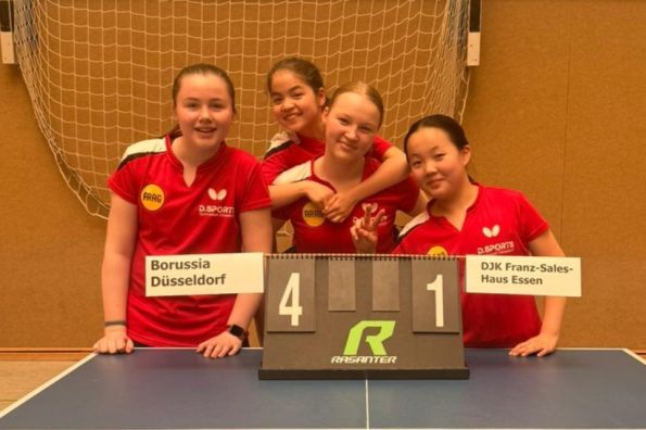 Bei den Mädchen kamen für Düsseldorf Emily He, Sofia Zhmudenko, Sophia Luzar und Julie Lochey zum Einsatz. Die vier Mädchen ließen sowohl Fredeburg, als auch Troisdorf in der Vorrunde keine Chancen und zogen ungefährdet ins Finale ein. Ihre Gegnerinnen dort kamen aus Essen, von der DJK Franz-Sales-Haus, die sich ebenfalls ohne größere Probleme gegen Bielefeld und Neuss durchsetzen. Madita und Emilia Höller sowie Luisa-Jiayi Fan versuchten alles, um den Düsseldorferinnen den Titel streitig zu machen, mussten aber nach knapp zwei Stunden die Überlegenheit der Borussia-Mädchen anerkennen und nach der 1:4-Niederlagen zum Sieg gratulieren.