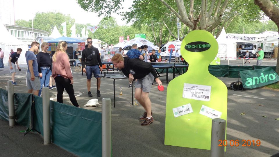 Auf der Sportmeile vor den Westfalenhallen gab es zahlreiche Mitmachaktionen, darunter auch einen Sport-Decathlon. Das Team des Kreises Dortmund/Hamm um Marcel Sillus und Gerald Hoppadietz hatten alle Hände voll zu tun, die vielen Spielwünsche zu erfüllen. „Der Stand war eigentlich rund um die Uhr sehr gut besucht“ resümierte Gerald Hoppadietz. Tischtennis präsentierte sich beim Kirchentag als Freizeitsport der Spaß macht und die Menschen verbindet.