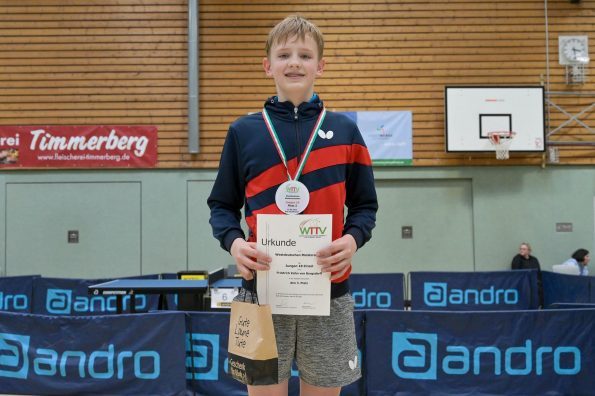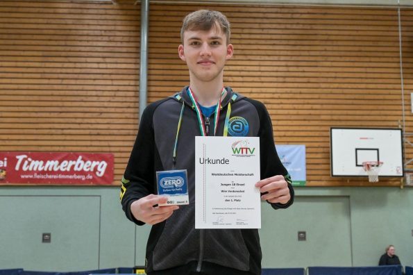 Los ging es am Samstag mit den älteren Athleten, der U18-Konkurrenz. Bei den Jungen setzte sich mit Wim Verdonschot (Borussia Dortmund), der im gesamten Turnier lediglich drei Sätze abgeben musste; verdient der topgesetzte Spieler durch. Sehr erfreulich war hier das Abschneiden der beiden U15-Spieler Friedrich Kühn von Burgsdorff (Post SV Gütersloh) und Noah Hersel (1. FC Köln), die sich beide erst dem späteren Sieger mit 3:0 bzw. 3:1 geschlagen geben mussten. Noah schaffte es im Finale sogar, Wim fast in den Entscheidungssatz zu zwingen, verlor den vierten Satz aber nach hartem Kampf mit 10:12. Platz drei sicherte sich neben Friedrich, Chris Andersen 8DJK Germania Lenkerbeck), der im Halbfinale Noah mit 1:3 unterlegen war.
