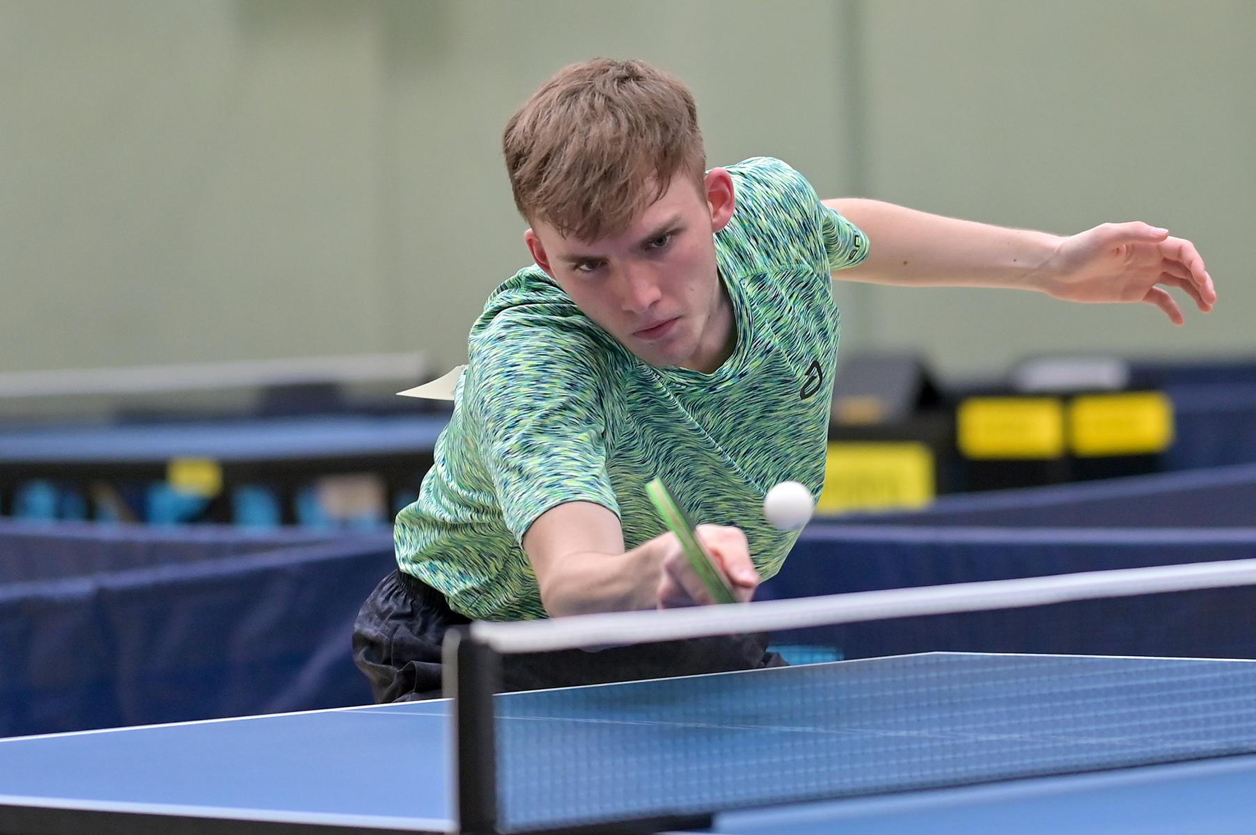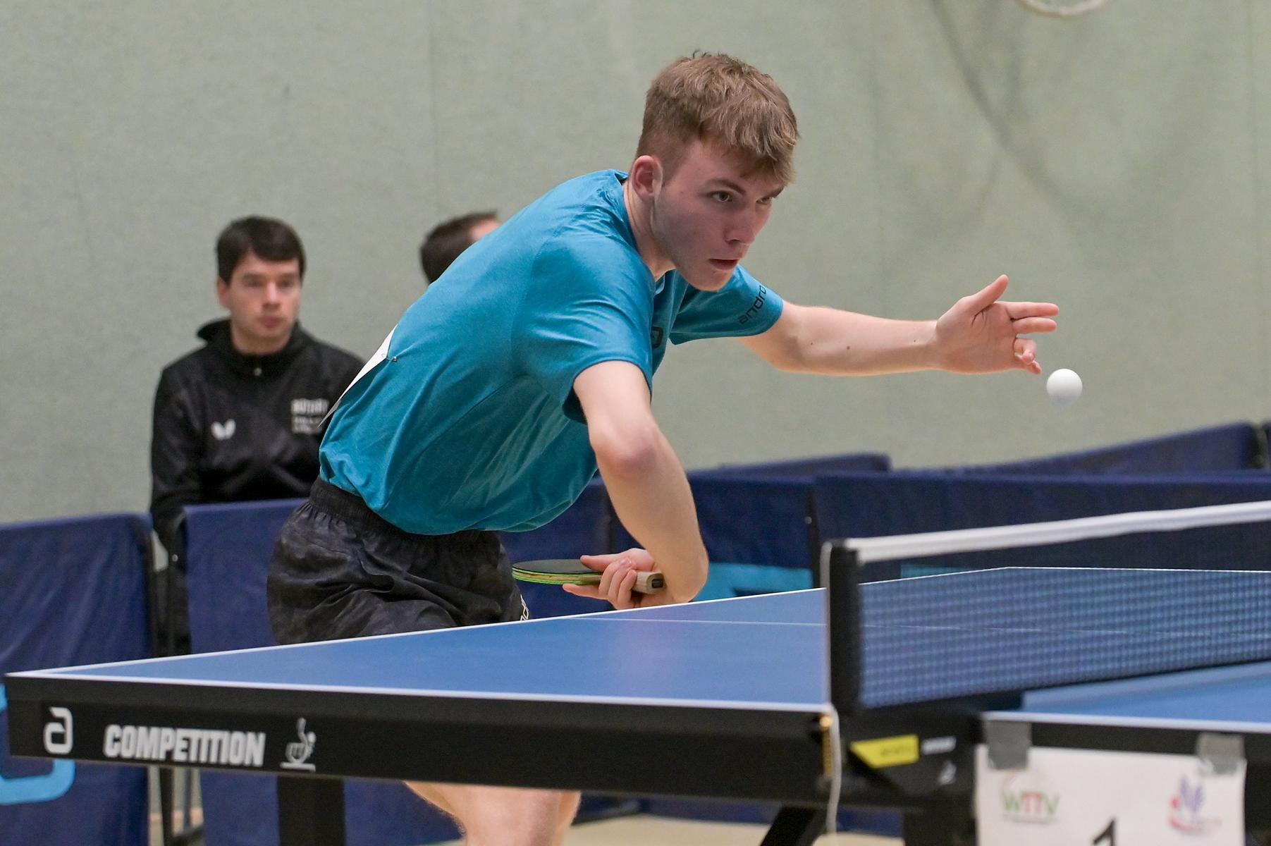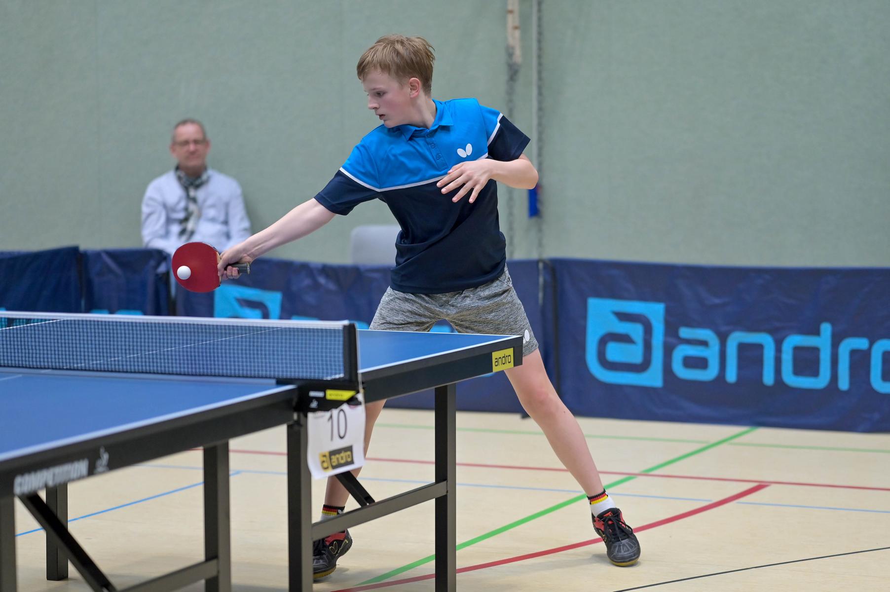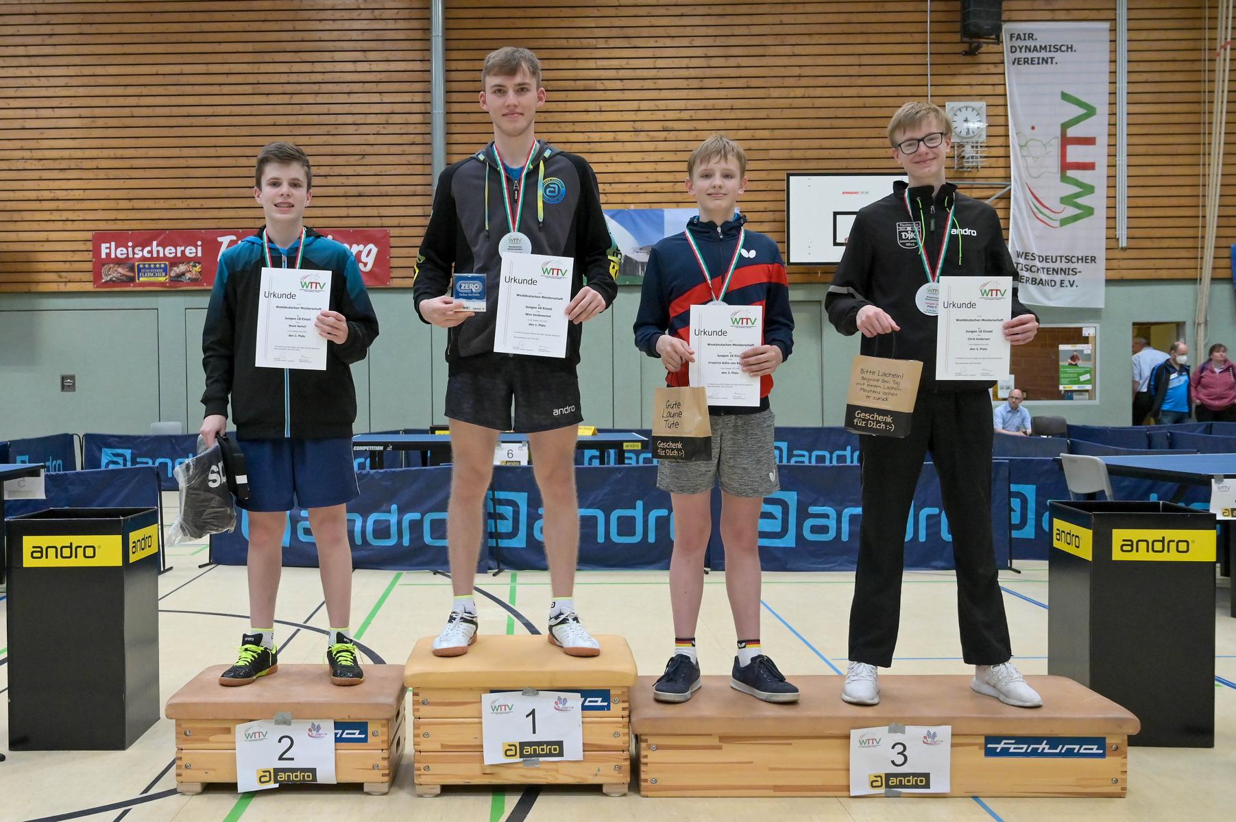 Los ging es am Samstag mit den älteren Athleten, der U18-Konkurrenz. Bei den Jungen setzte sich mit Wim Verdonschot (Borussia Dortmund), der im gesamten Turnier lediglich drei Sätze abgeben musste; verdient der topgesetzte Spieler durch. Sehr erfreulich war hier das Abschneiden der beiden U15-Spieler Friedrich Kühn von Burgsdorff (Post SV Gütersloh) und Noah Hersel (1. FC Köln), die sich beide erst dem späteren Sieger mit 3:0 bzw. 3:1 geschlagen geben mussten. Noah schaffte es im Finale sogar, Wim fast in den Entscheidungssatz zu zwingen, verlor den vierten Satz aber nach hartem Kampf mit 10:12. Platz drei sicherte sich neben Friedrich, Chris Andersen 8DJK Germania Lenkerbeck), der im Halbfinale Noah mit 1:3 unterlegen war.