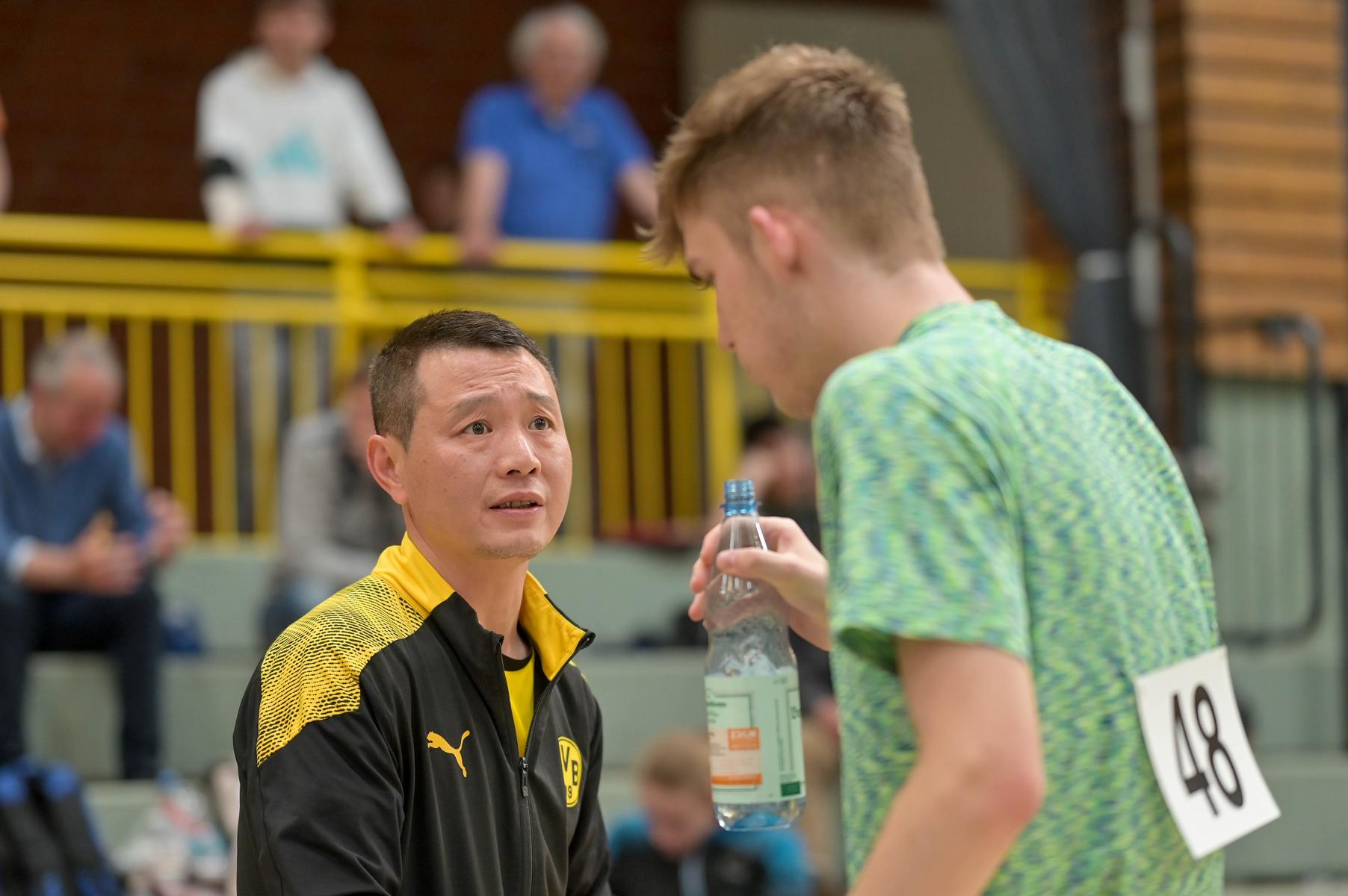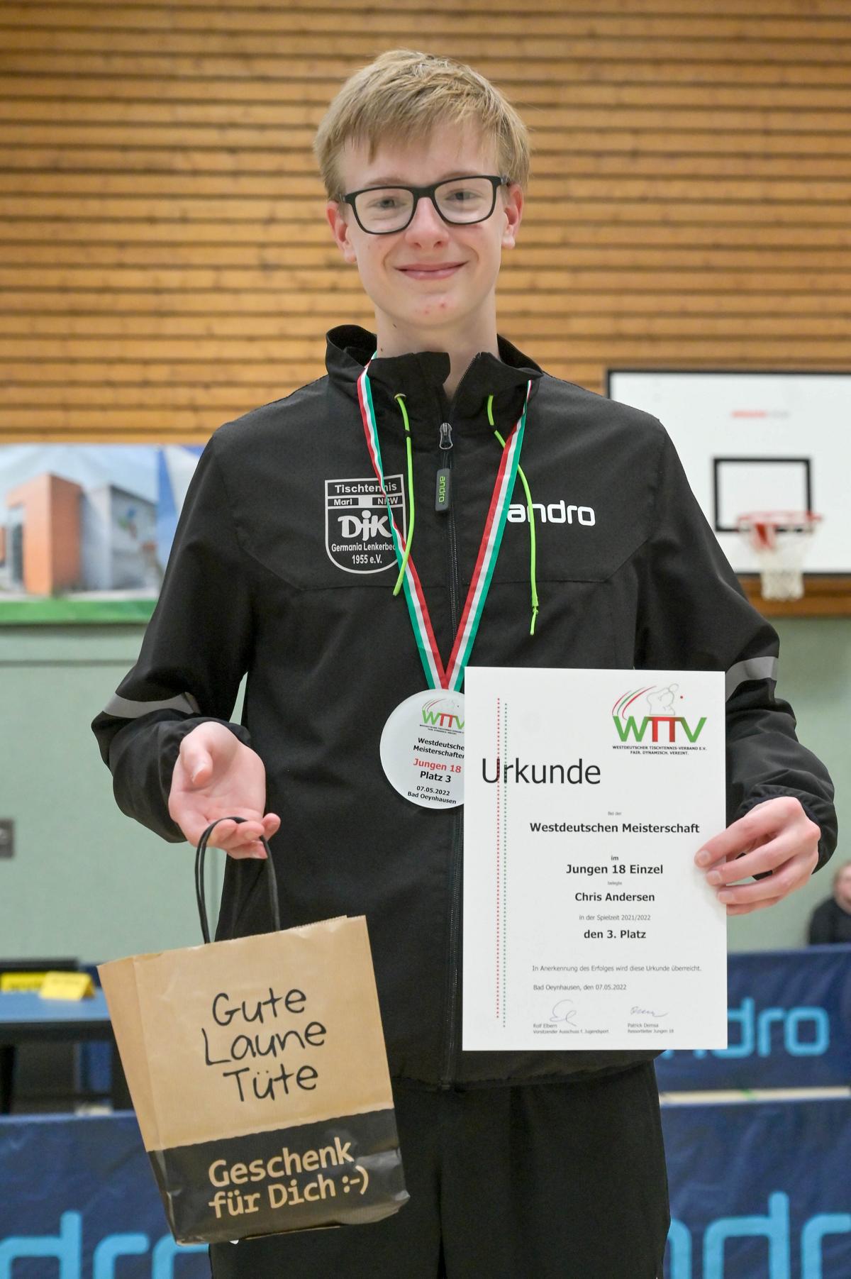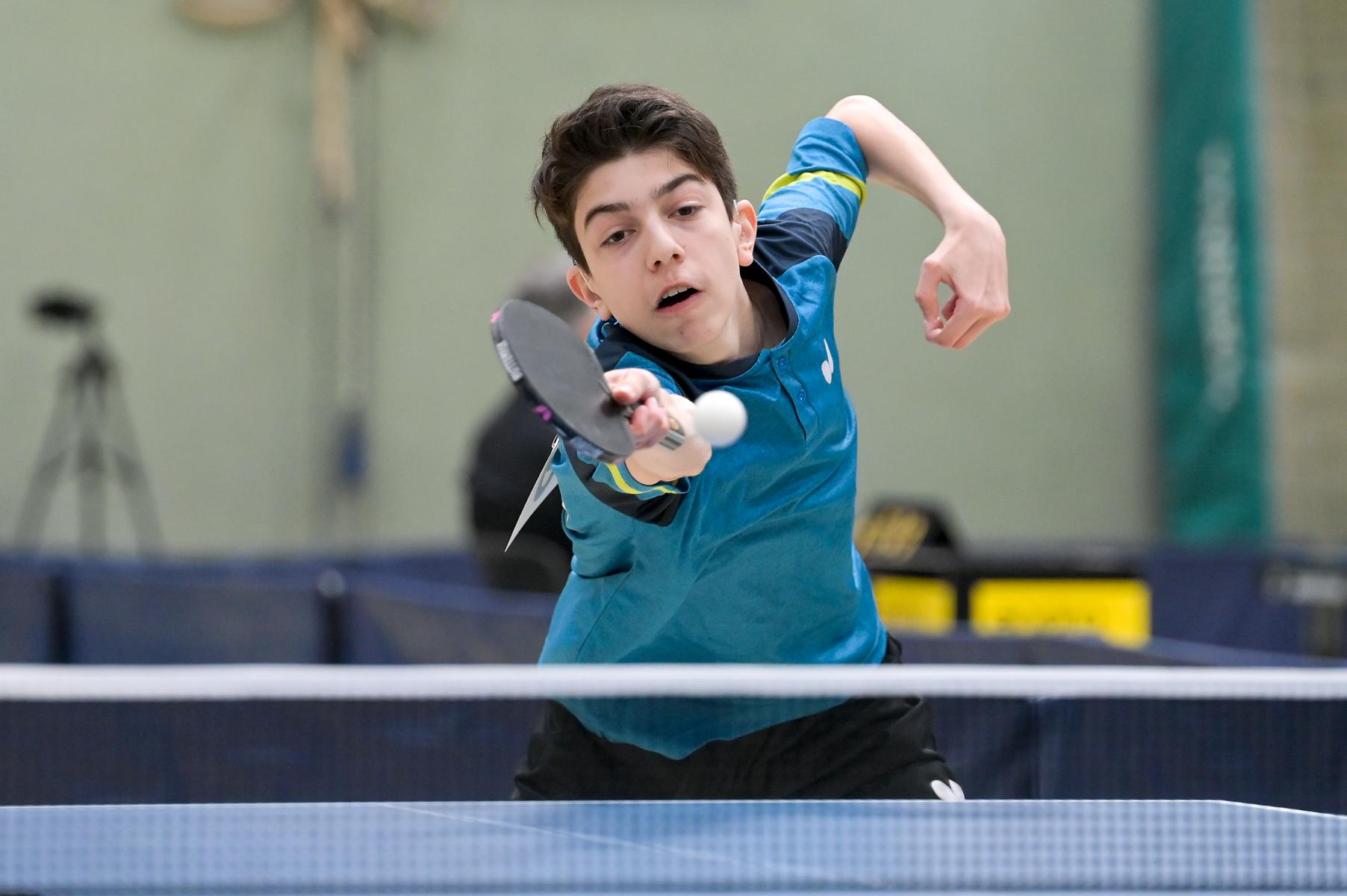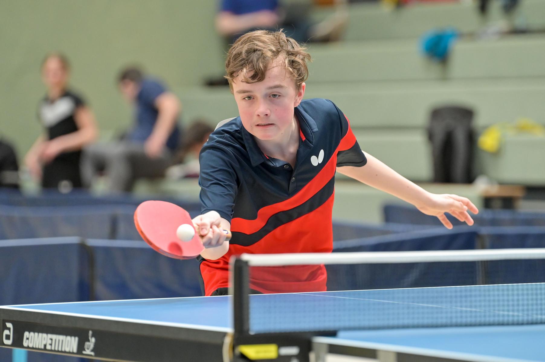 Los ging es am Samstag mit den älteren Athleten, der U18-Konkurrenz. Bei den Jungen setzte sich mit Wim Verdonschot (Borussia Dortmund), der im gesamten Turnier lediglich drei Sätze abgeben musste; verdient der topgesetzte Spieler durch. Sehr erfreulich war hier das Abschneiden der beiden U15-Spieler Friedrich Kühn von Burgsdorff (Post SV Gütersloh) und Noah Hersel (1. FC Köln), die sich beide erst dem späteren Sieger mit 3:0 bzw. 3:1 geschlagen geben mussten. Noah schaffte es im Finale sogar, Wim fast in den Entscheidungssatz zu zwingen, verlor den vierten Satz aber nach hartem Kampf mit 10:12. Platz drei sicherte sich neben Friedrich, Chris Andersen 8DJK Germania Lenkerbeck), der im Halbfinale Noah mit 1:3 unterlegen war.
