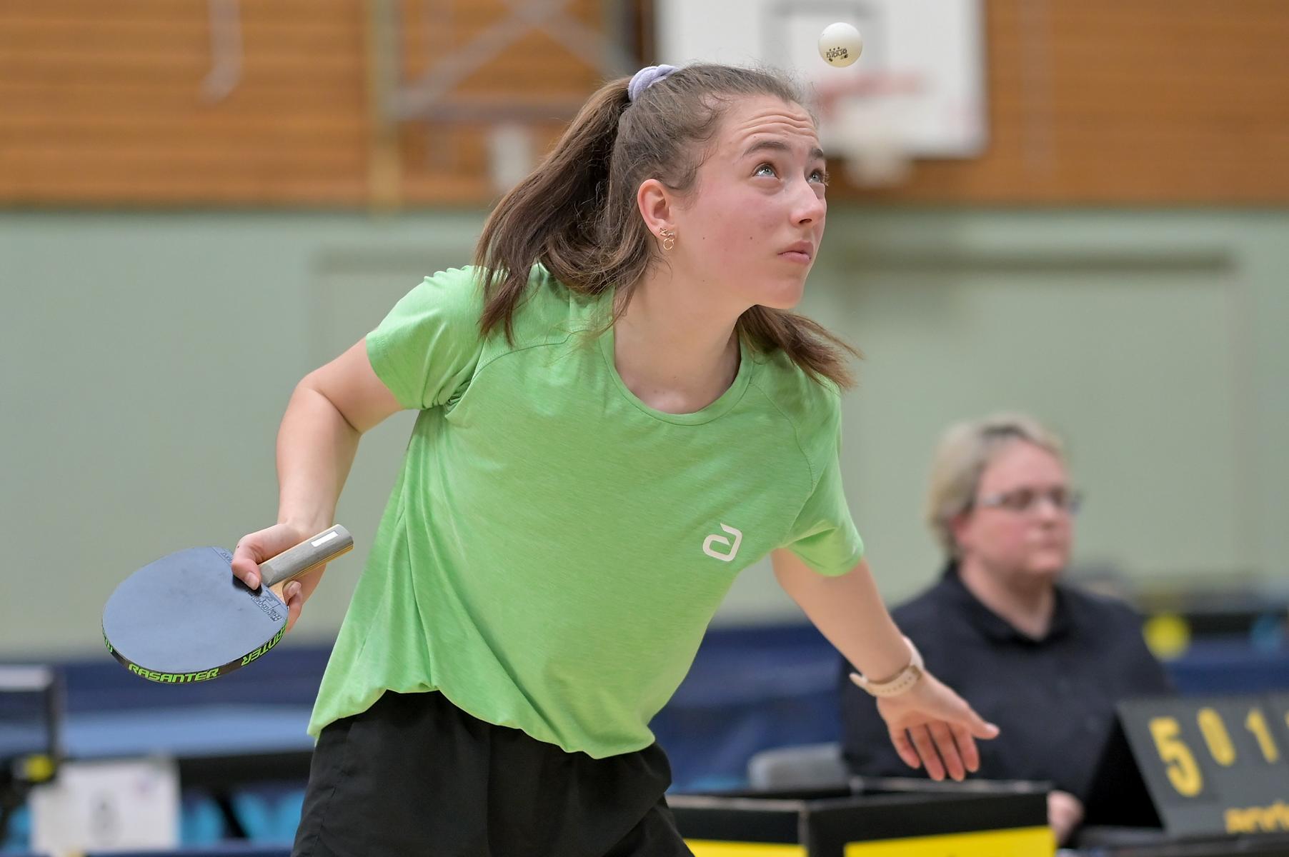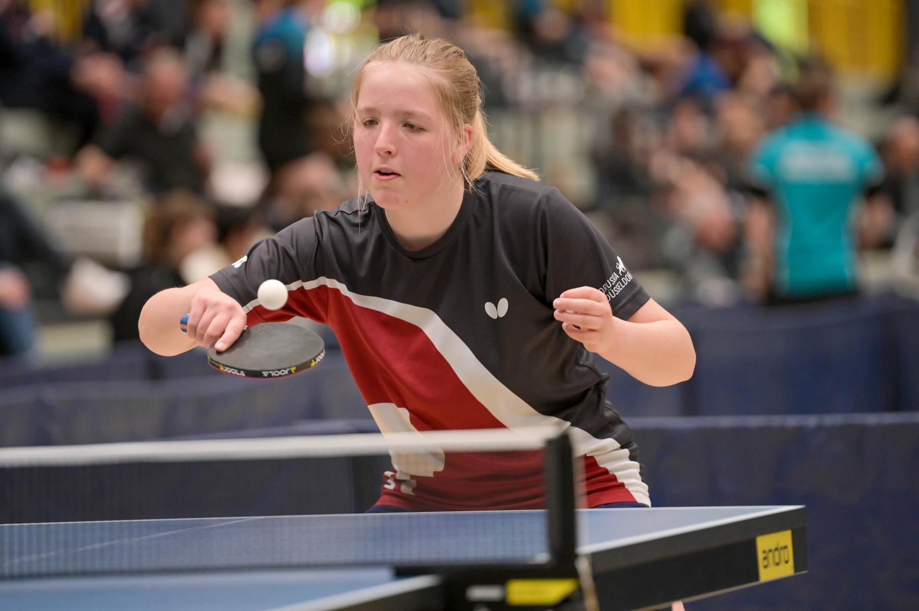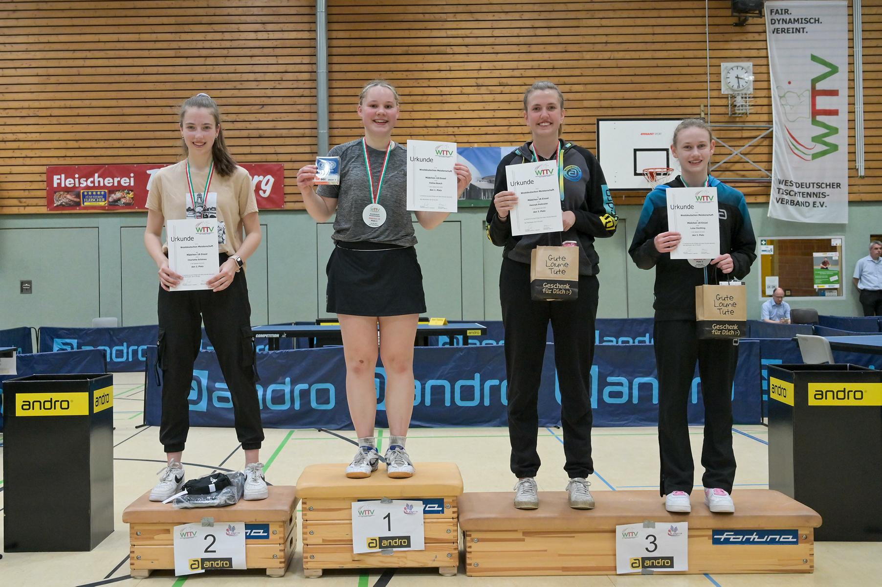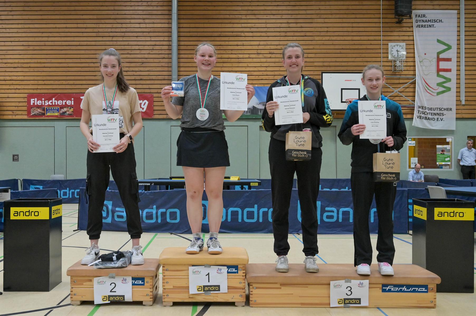 Auch bei den Mädchen 18 gab es in der Vorrunde keine Überraschungen und alle Favoritinnen zogen in die KO-Runde ein. Im Viertelfinale musste sich dann aber die an Position eins gesetzte Melinda Maiwald (TTV Hövelhof) Luisa Düchting (TTG Langenich) mit 1:3 geschlagen geben. Luisa traf dann im Halbfinale auf Felina Busch (SC Fortuna Bonn) und die beiden zeigten gerade im ersten Satz ein sehr spannendes Spiel, denn dieser endete mit 23:21 für Felina, die am Ende das Spiel dann in vier Sätzen für sich entscheiden konnte. Das zweite Halbfinale bestritten Charlotte Schönau (TTC GW Fritzdorf) und Hannah Pollmeier  (TTV Hövelhof). Auch dieses Spiel gestaltete sich äußerst knapp, denn alle Sätze wurden nur mit zwei Punkten Unterscheid gewonnen. Am Ende zog Charlotte mit einem 3:1 ins Finale gegen Felina ein.