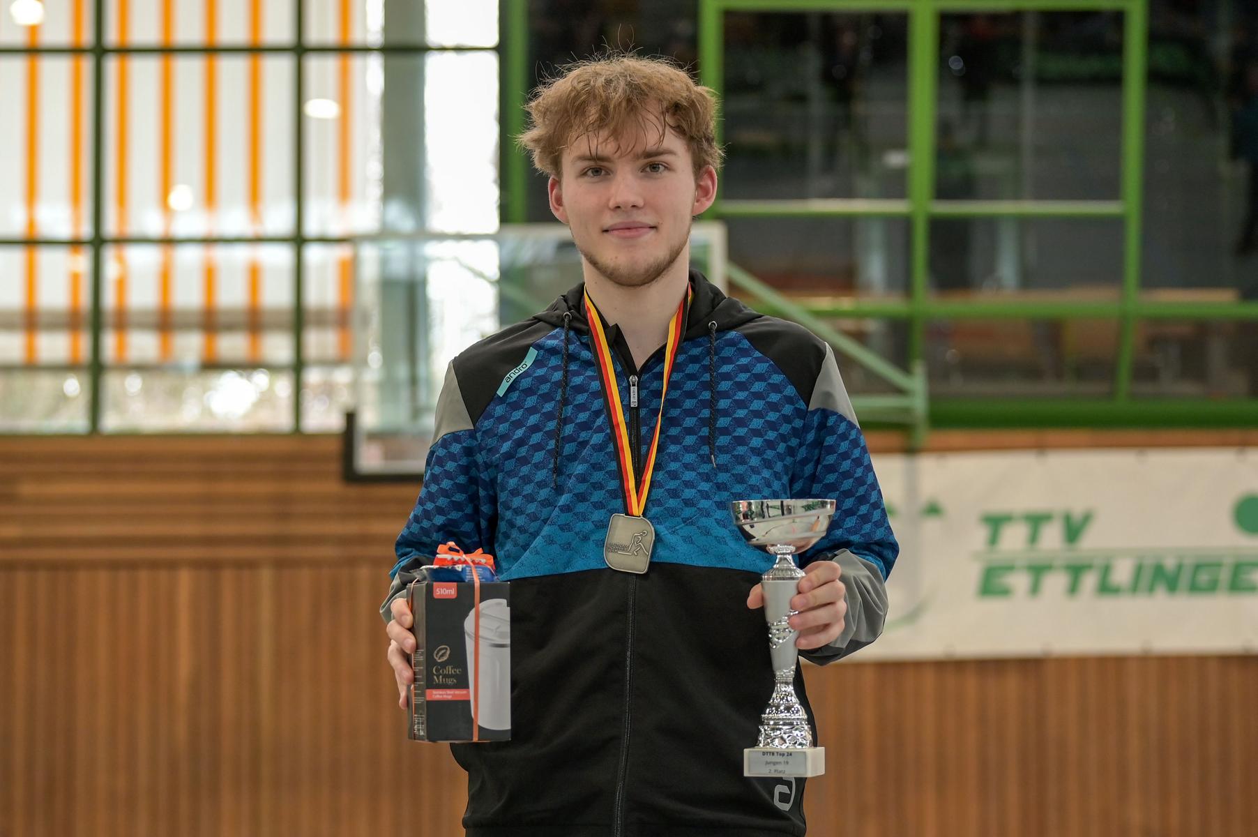 Gleich neun Starter in der Jungen 19 Klasse waren vertreten. Wim Verdonschot (Borussia Dortmund) hat die Gruppe gewonnen und wollte am Sonntag unbedingt mit Edelmetall zurückkehren. Und dies schaffte er auch. Gegen Friedrich gewann er sein erstes Spiel mit 3:1 und im Anschluss mit 3:0 das Halbfinale gegen Tobias. So stand er im Finale gegen Llyton Ullmann aus Hamburg. Nach einem 0:2-Rückstand schaffte er noch den Satzausgleich. Im letzten Satz des Tages kamen die Zuschauer auf ihre Kosten und feuerten beide Spieler an. Wim hat die Chancen zum Sieg liegen lassen und musste sich mit 12:10 geschlagen geben. Mit der Silbermedaille schaffte er sein Ziel, Edelmetall mit nach Hause zu nehmen.
