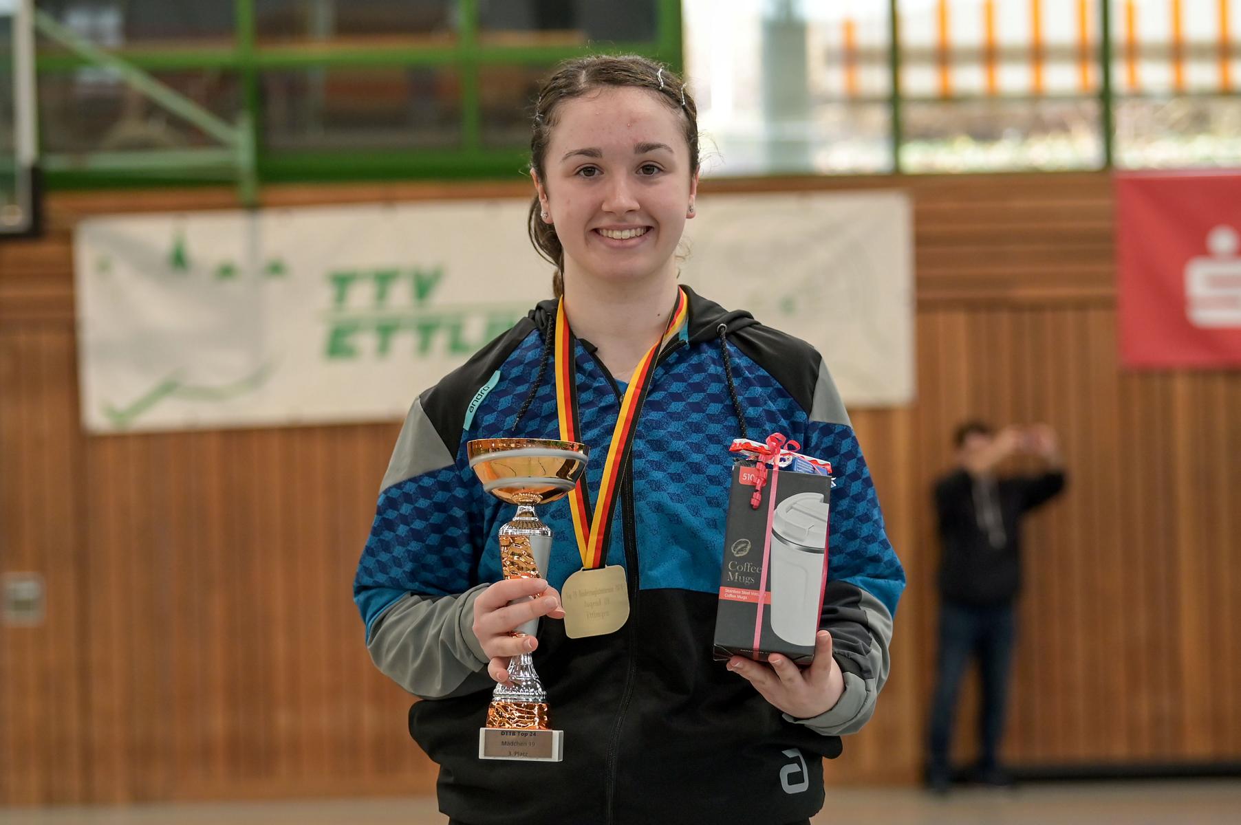 Reha war am Samstag in einer guten Form und gewann ihre Gruppe mit 4:1. An ihre guten Leistungen knüpfte sie am Sonntag an und konnte nach einem klaren 3:0 Sieg über Sophie Krießbach (HETTV) ins Finale einziehen. Mit 2:0 führte sie bereits gegen Boa Chau Elisa Nguyen (TTBW). Den dritten Satz verlor sie leider mit 9:11 und auch Satz vier und fünf ging an ihre Gegnerin. Reha kann dennoch sehr stolz auf sich sein und durfte bei der Siegerehrung die Silbermedaille in Empfang nehmen.