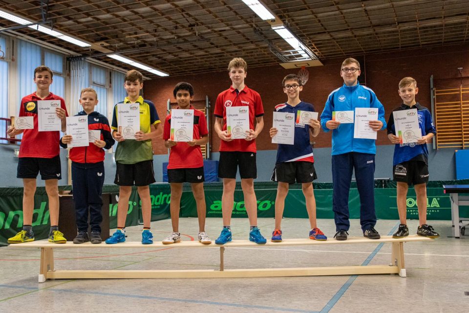 Bevor László die Siegerurkunde entgegennehmen konnte, lag ein langer und spannender Wettkampftag hinter ihm, der zeigte, dass in der Jungen-Konkurrenz fast Jeder gegen Jeden gewinnen konnte. So kam es auch in Gruppe A, in der die drei Erstplatzierten, László Mohácsy, Friedrich Kühn von Burgsdorff (Post SV Gütersloh) und Emilo Schulz (TTC Lövenich), sich gegenseitig die Punkte raubten, so dass alle drei am Ende eine 4:1-Bilanz aufwiesen. In der Gruppe B machte vor allem Melvin Lehnen (TUSEM Essen) mit einer weißen Weste und 5:0-Spielen auf sich aufmerksam.