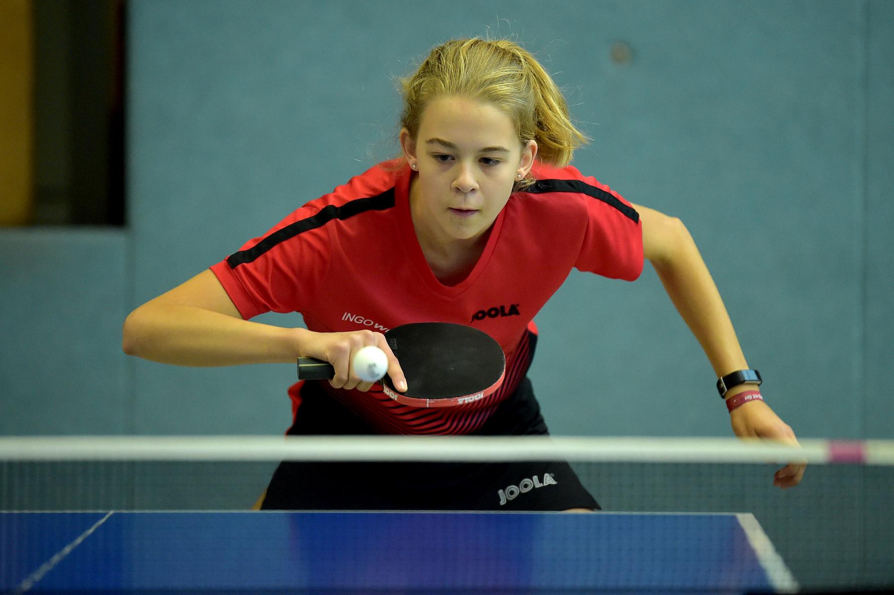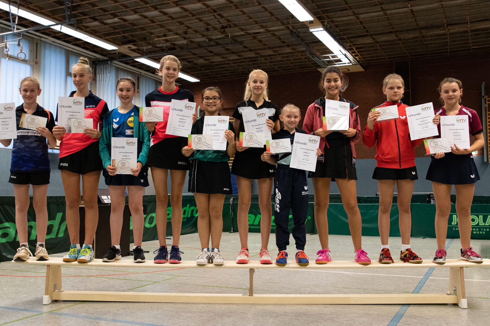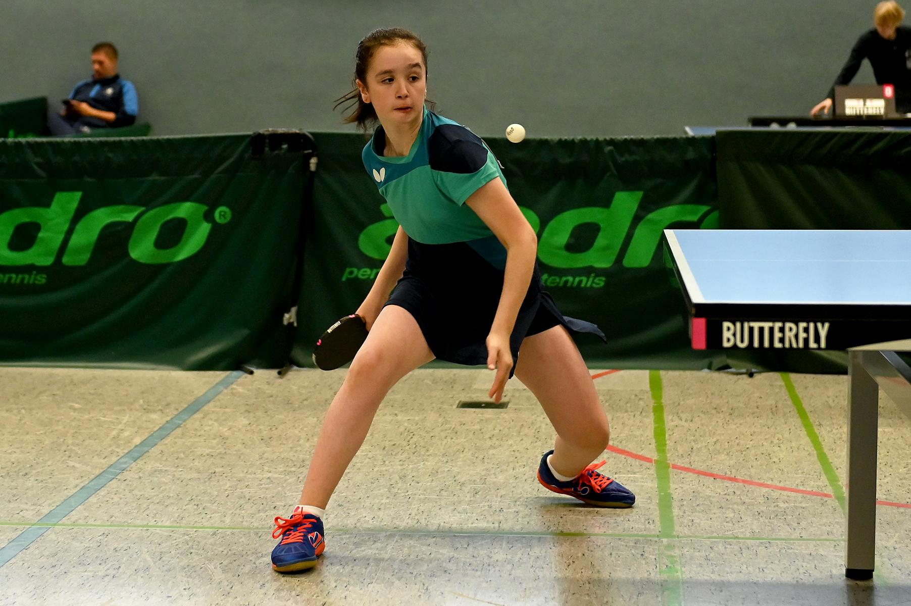 Ganz anders sah das Geschehen bei den Mädchen 15 aus. Hier gab es mit Luisa Düchting eine Spielerin, die mit einer 9:0-Bilanz die Rangliste etwas überraschend ungeschlagen und souverän gewinnen könnte. Die Überlegenheit von Luisa, die noch bei der Jugend 13 spielberechtigt ist, zeigte sich auch daran, dass sie in den neun Spielen lediglich drei Sätze abgeben musste. Einen Satz in wohl einem der Schlüsselspiele dieser Rangliste gegen die zwei Jahre ältere und bis zur Endrangliste freigestellte Melinda Mailwald (TTV Hövelhof). Die beiden Mitfavoritinnen trafen bereits in der dritten Runde aufeinander. Es entwickelte sich ein sehr spannendes und knappes Spiel, indem alle Sätze nur mit zwei Punkten Unterschied entschieden wurden. Dieser Sieg gab Luisa Selbstvertrauen und so revanchierte sie sich auch gegen Eireen Kalaitzidou (Borussia Düsseldorf) für die knappe 2:3-Niederlage vor ein paar Wochen beim TOP 10 der Mädchen 13. Melinda konnte gegen Eireen mit 3:1 gewinnen und sicherte sich so mit nur einer Niederlage Platz zwei und damit ebenfalls die Fahrkarte zum TOP 48. Den dritten Rang belegte Eireen, die durch ihren Sieg beim TOP 10 der Mädchen 13 diese schon sicher hatte.