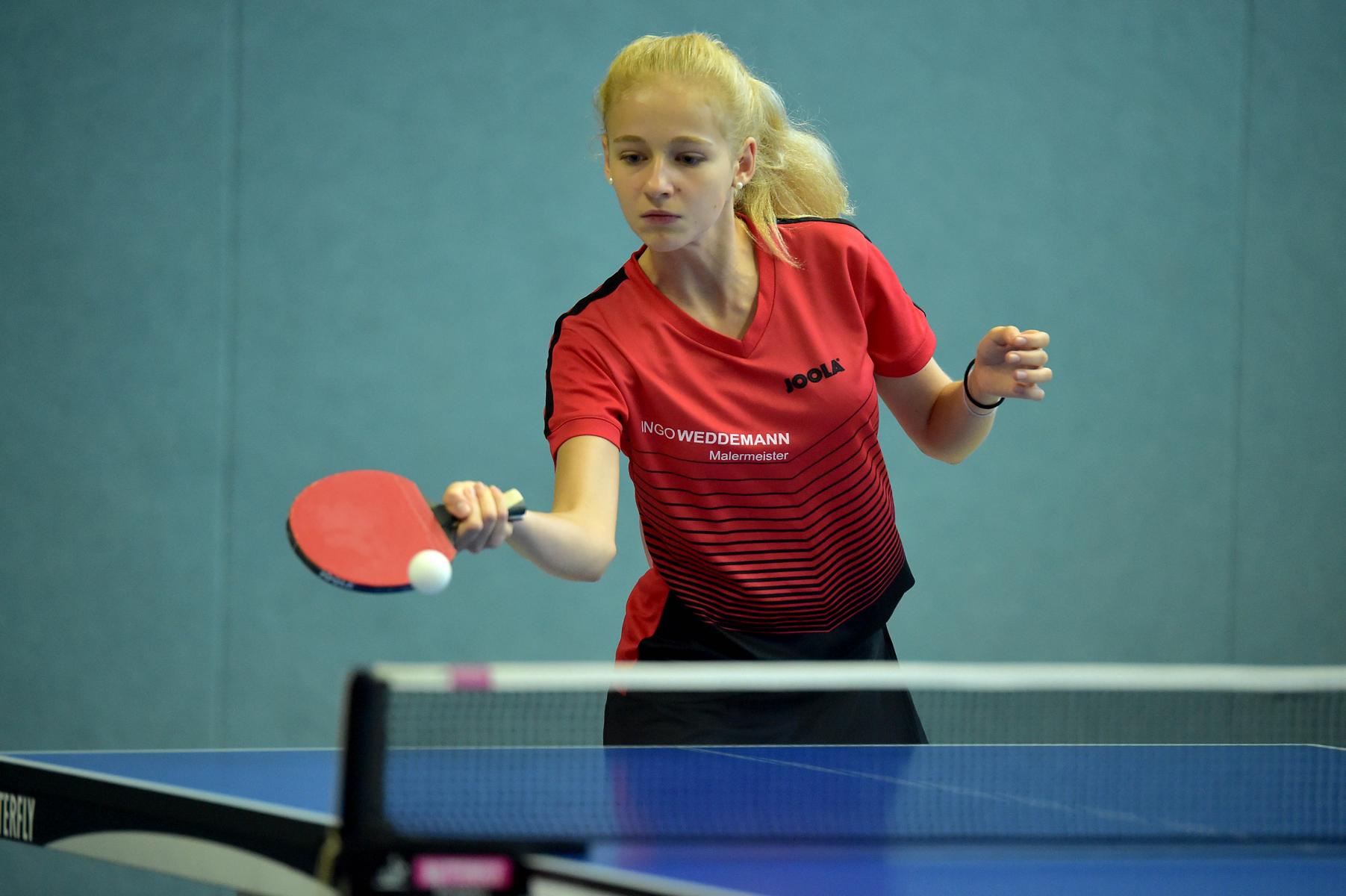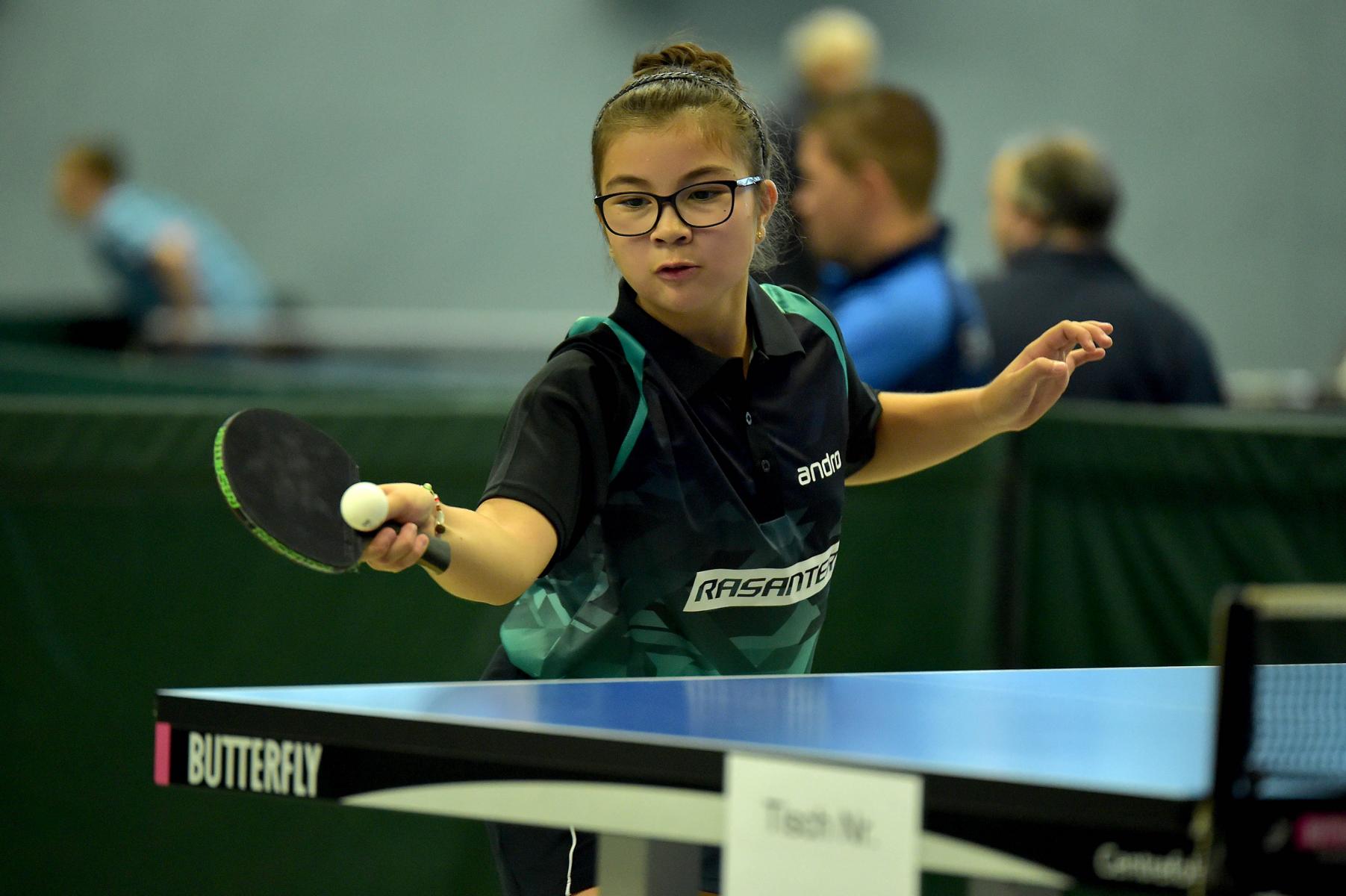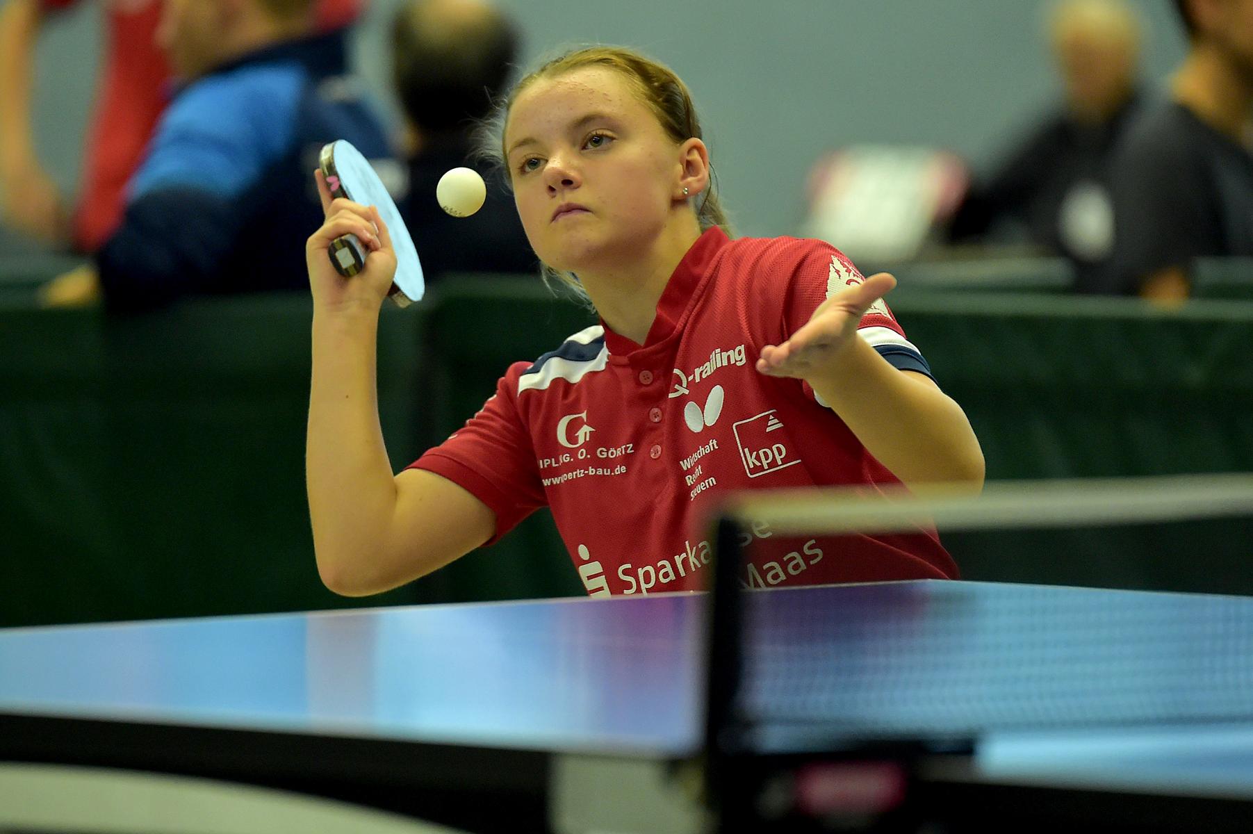 Ganz anders sah das Geschehen bei den Mädchen 15 aus. Hier gab es mit Luisa Düchting eine Spielerin, die mit einer 9:0-Bilanz die Rangliste etwas überraschend ungeschlagen und souverän gewinnen könnte. Die Überlegenheit von Luisa, die noch bei der Jugend 13 spielberechtigt ist, zeigte sich auch daran, dass sie in den neun Spielen lediglich drei Sätze abgeben musste. Einen Satz in wohl einem der Schlüsselspiele dieser Rangliste gegen die zwei Jahre ältere und bis zur Endrangliste freigestellte Melinda Mailwald (TTV Hövelhof). Die beiden Mitfavoritinnen trafen bereits in der dritten Runde aufeinander. Es entwickelte sich ein sehr spannendes und knappes Spiel, indem alle Sätze nur mit zwei Punkten Unterschied entschieden wurden. Dieser Sieg gab Luisa Selbstvertrauen und so revanchierte sie sich auch gegen Eireen Kalaitzidou (Borussia Düsseldorf) für die knappe 2:3-Niederlage vor ein paar Wochen beim TOP 10 der Mädchen 13. Melinda konnte gegen Eireen mit 3:1 gewinnen und sicherte sich so mit nur einer Niederlage Platz zwei und damit ebenfalls die Fahrkarte zum TOP 48. Den dritten Rang belegte Eireen, die durch ihren Sieg beim TOP 10 der Mädchen 13 diese schon sicher hatte.