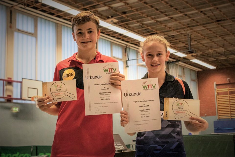Luisa Düchting (TTG Langenich) und László Mohácsy (Borussia Düsseldorf) verteidigen ihre Titel vom TOP 24/16 und gewinnen auch das TOP 12/10 Ranglistenturnier der Jugend 15 beim TuS Holzen-Sommerberg. Damit sichern sich beide das begehrte Ticket für das TOP 48 Bundesranglistenturnier am 19./20. Oktober.