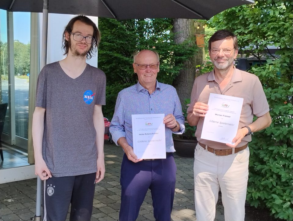 Tim Niggemann (links) ehrte zwei langjährige Spieler des SV RW Mastholte: Heinz Peterschröder (mittig) wurde für seine 50-jährige Spielerlaufbahn mit der Goldenen Spielernadel und sein Doppelpartner Werner Frenser (rechts) für 40-jährige Spieleraktivität mit der Silbernen Spielernadel ausgezeichnet.