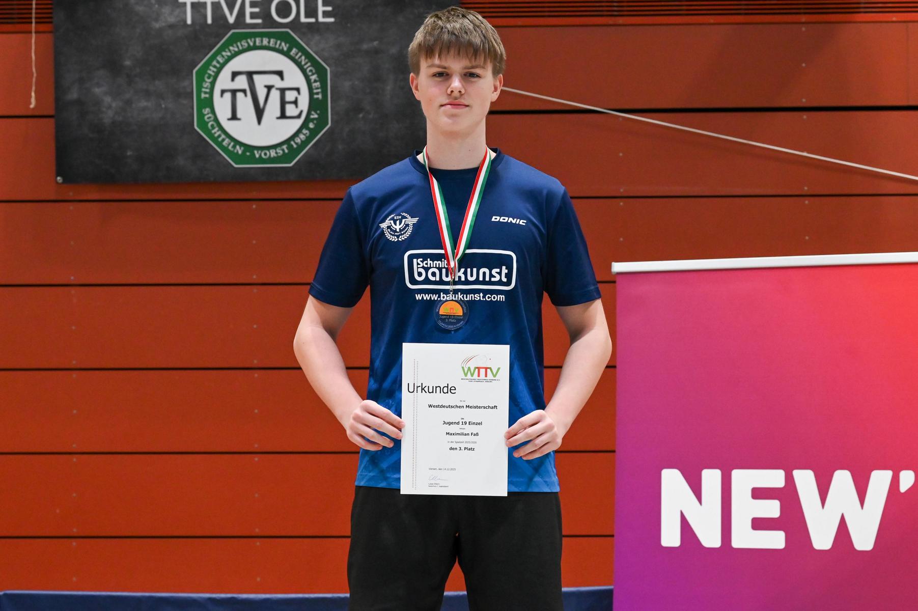 Wie gut Maximilian Faß an diesem Wochenende aufgelegt war, zeigte er spätestens im Viertelfinale. In einem spannenden Fünfsatzmatch setzte er sich mit 3:2 gegen Danielius Galatiltis durch. Im Halbfinale war dann allerdings Endstation: Marius Strahl erwies sich nach seinem starken 3:1-Erfolg gegen den an Nummer eins gesetzten Alexander Sahakiants im Viertelfinale als zu stark. Trotz der 0:3-Niederlage durfte sich Maximilian über die Bronzemedaille freuen.