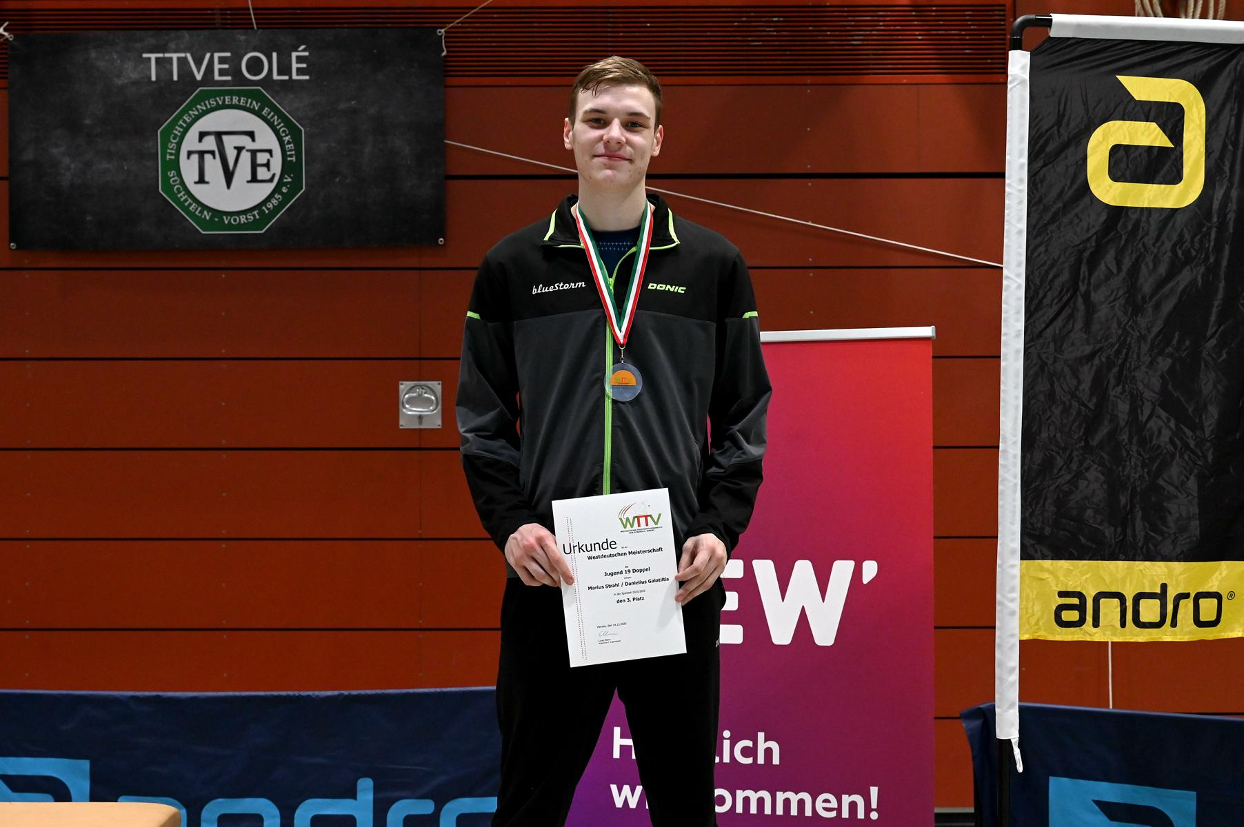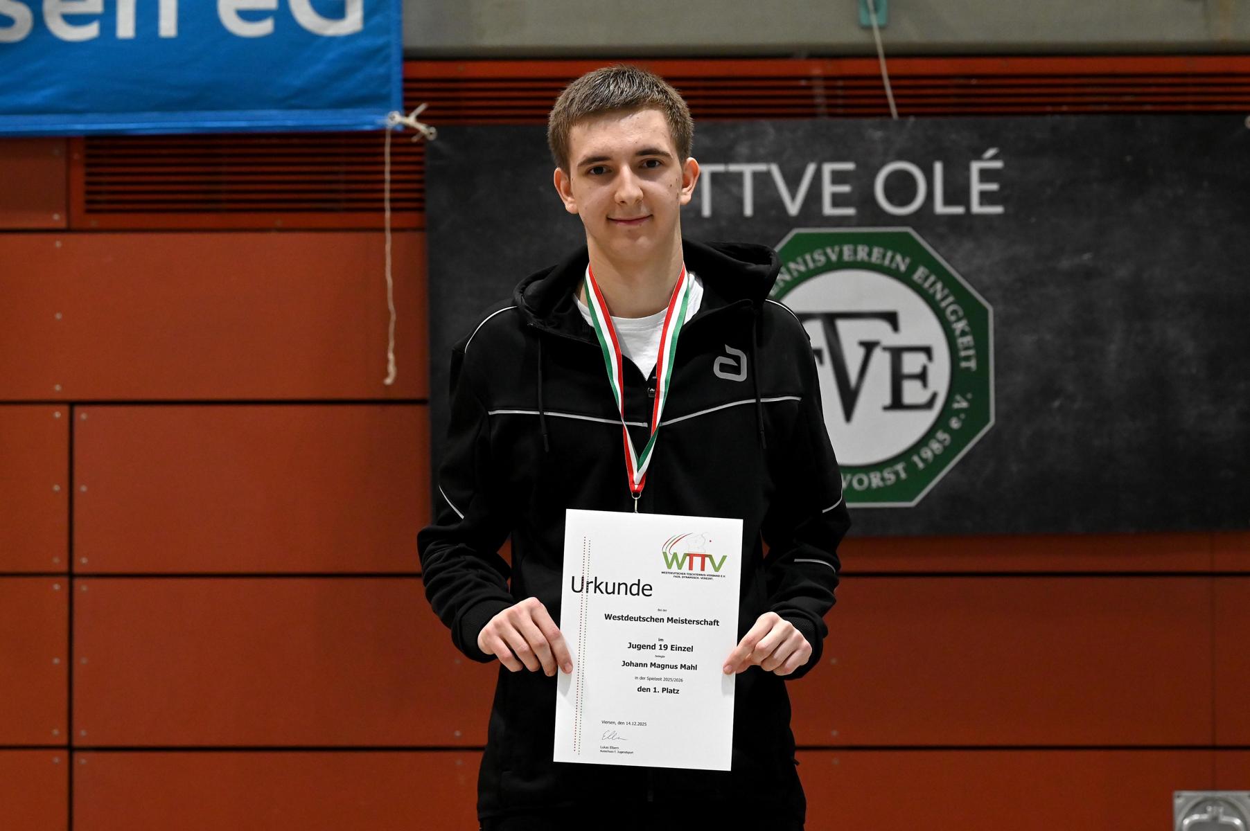 Für Johann Mahl war der Platz ganz oben auf dem Treppchen fast schon Routine. Johann gewann zum dritten Mal in Folge den Titel bei den Westdeutschen Meisterschaften der Jugend 19 und schrieb damit WTTV-Geschichte: Er ist der erste Spieler überhaupt, dem dieses Kunststück gelungen ist.