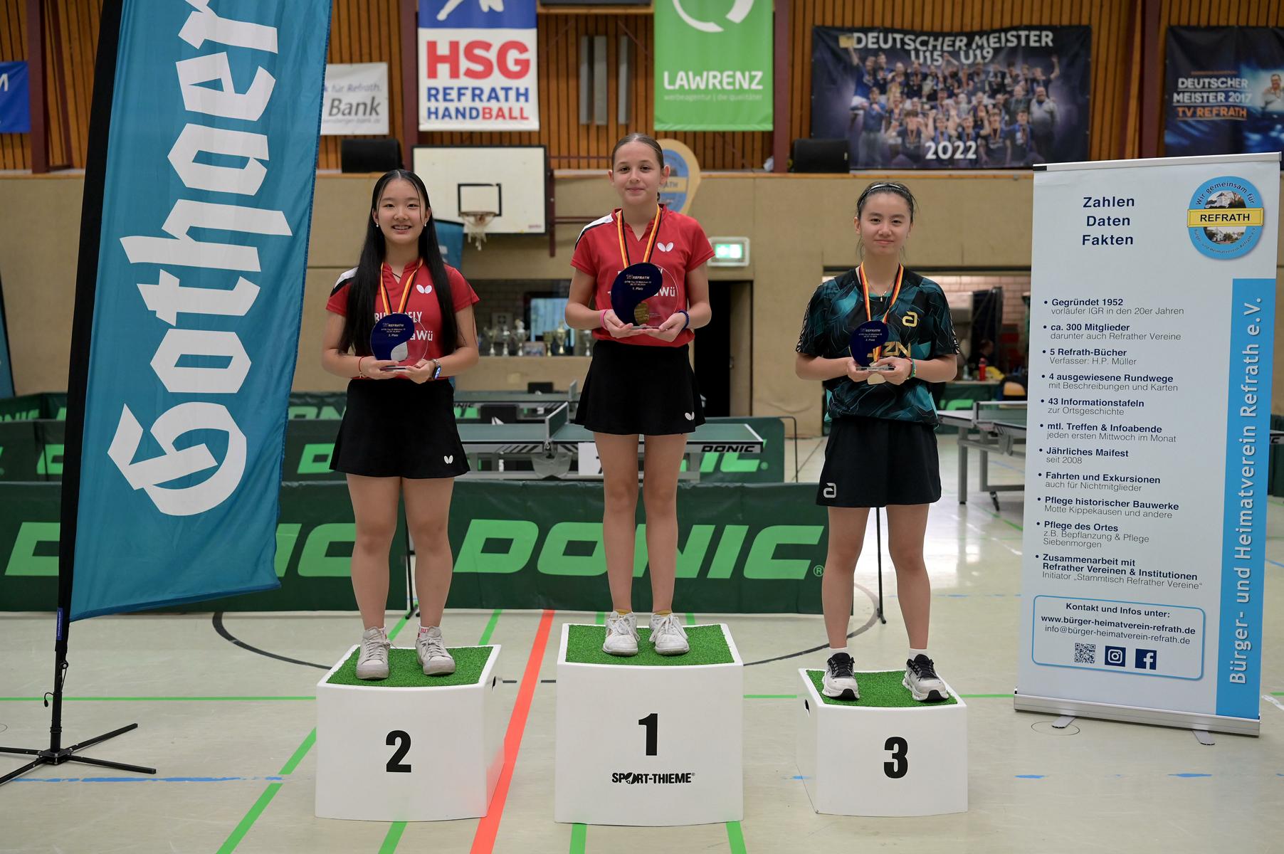 Bei den Mädchen erspielte sich Emma den Gruppensieg (7:0). Zusammen konnten alle sieben Gegnerinnen Emma nur drei Sätze abnehmen. Linyun wurde Gruppenzweite mit nur einer Niederlage gegen Chenhao Chen aus Baden-Württemberg. Emily unterlag in ihrer Gruppe zwar Hannah Schlauch aus Hessen und Melissa Bill aus Bayern, konnte aber trotzdem Zweite werden, da Schlauch gegen Pia Kaltenschnee verloren hatte. Emilia wurde mit einer 2:5-Bilanz Gruppensechste. Emilia ging in fünf ihrer sieben Partien über die volle Distanz und gab keinen Ballwechsel verloren.