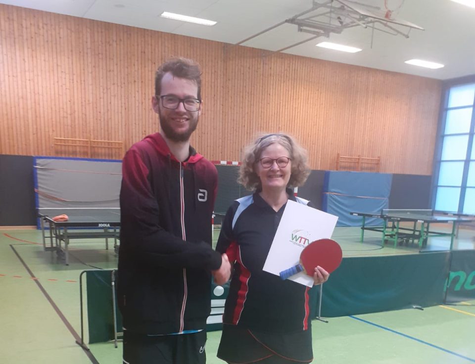 Tim Niggemann, der die Ehrung stellvertretend übernahm, überreichte die Auszeichnung in der Rußheideschule – begleitet von kräftigem Applaus der anwesenden Spielerinnen und Spieler des Vereins. Die Auszeichnung würdigt das langjährige, herausragende Engagement von Karin Kruse für den Tischtennissport.