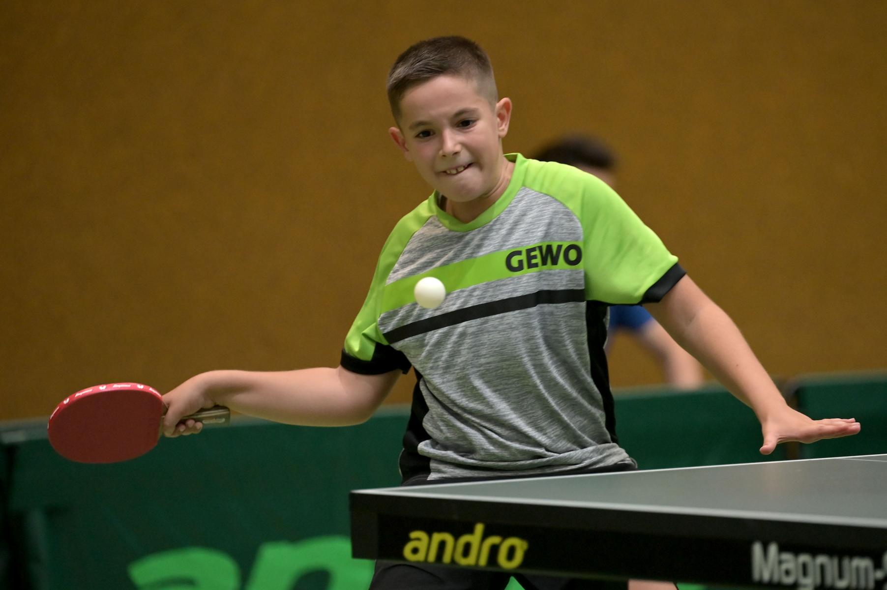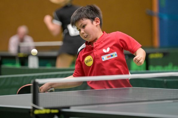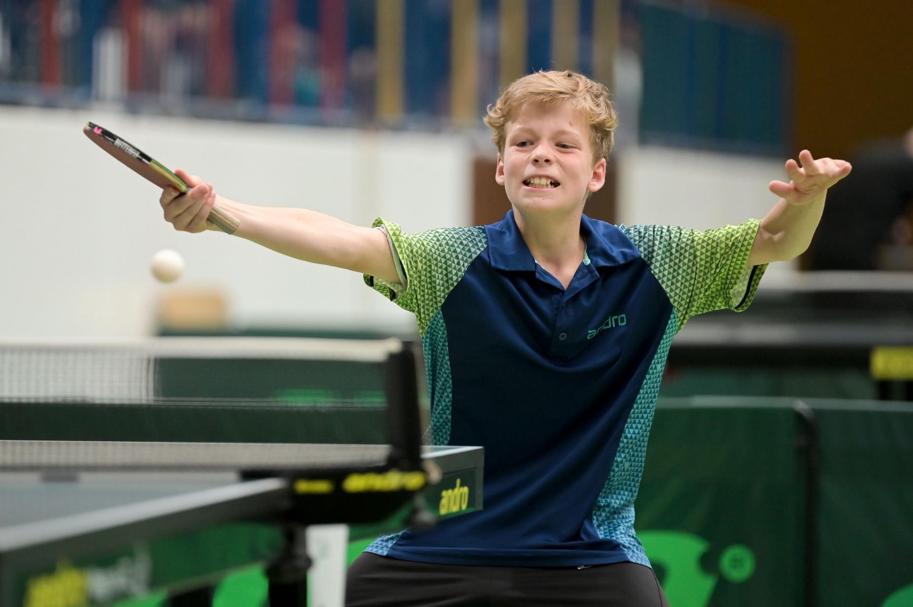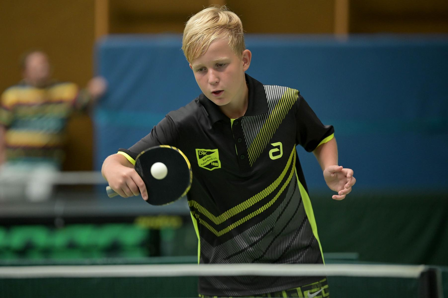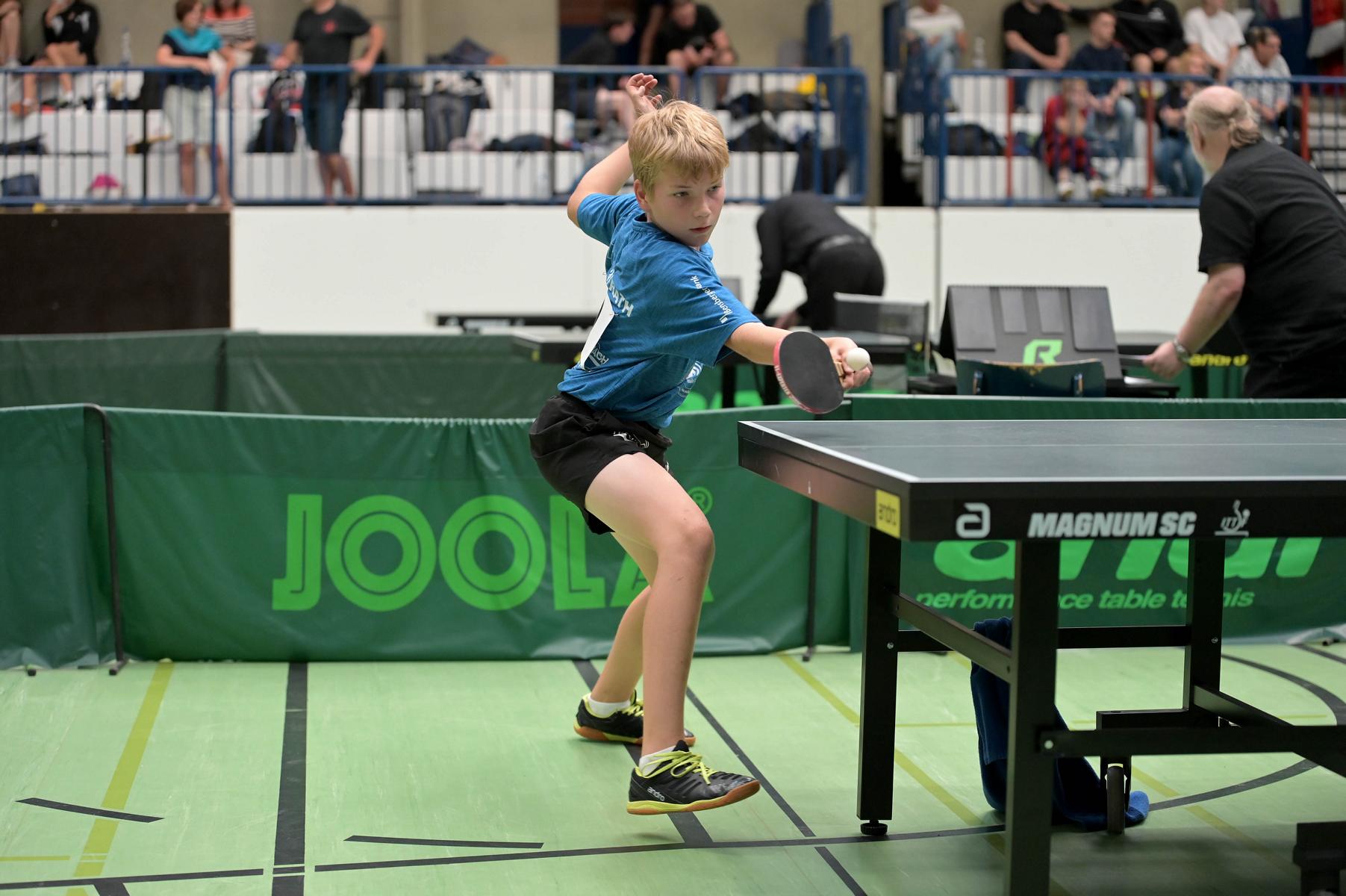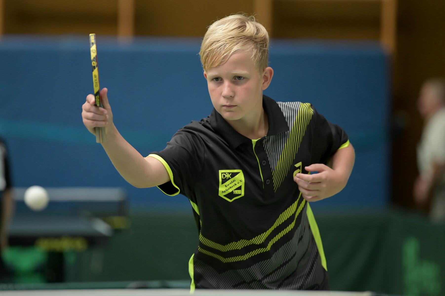 Bei den Jungen13 hatte wohl niemand so richtig Tom Henseler auf dem Schirm. Schon in der ersten Runde rang Tom den Mitfavoriten Dorian Lheriau mit 3:2 nieder. Dieser Sieg gab dem Linkshänder Tom viel Sicherheit und Selbstvertrauen, so dass er sich mit gutem Aufschlagspiel und unangenehmen Linkshändertopspins immer mehr ins Turnier reinspielte. Am Ende verlor er kein einziges Match und war der verdiente Sieger, der damit auch das Ticket zum Top48 der Jugend15 löste.