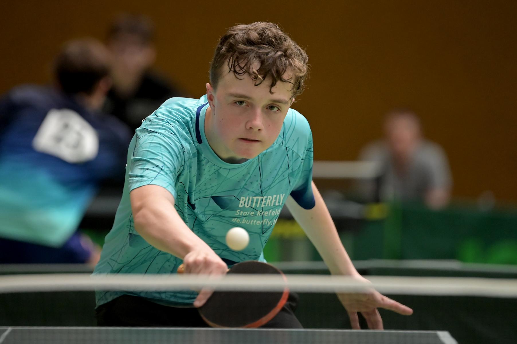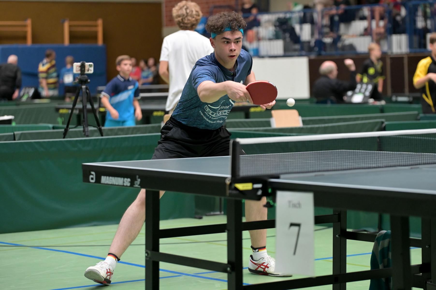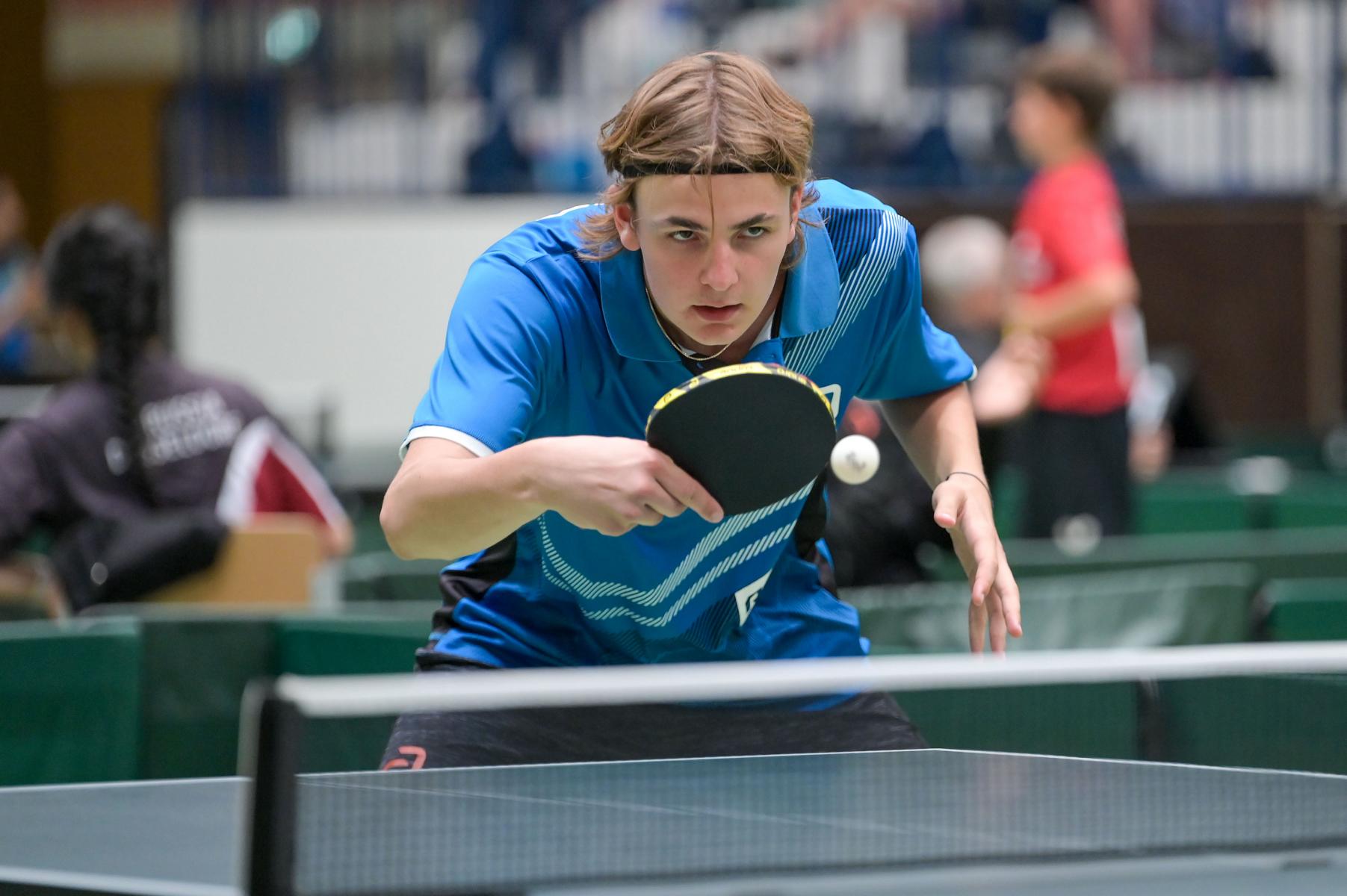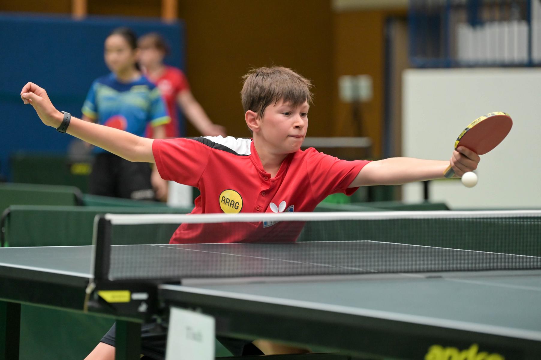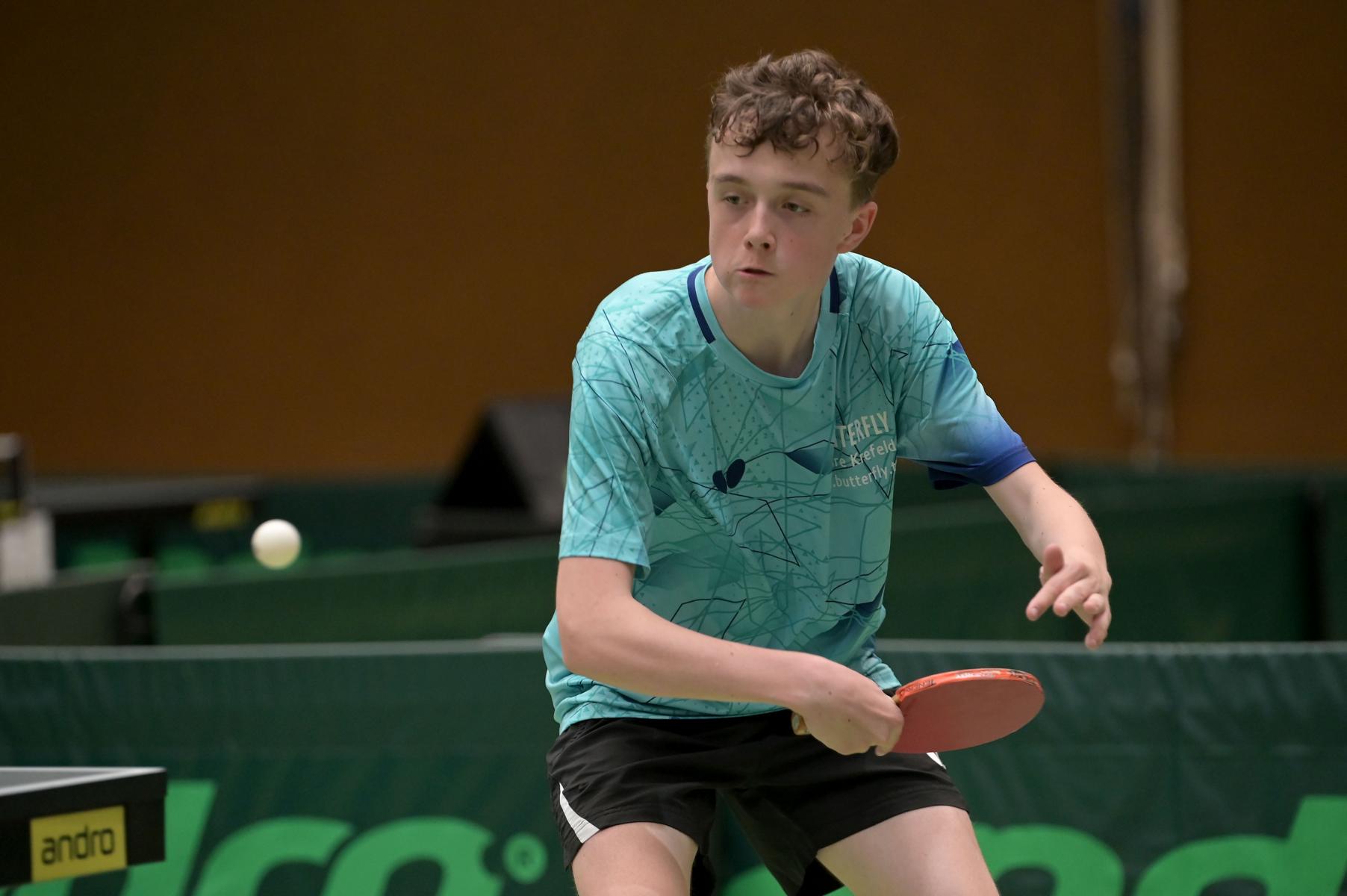 Bei den Jungen13 hatte wohl niemand so richtig Tom Henseler auf dem Schirm. Schon in der ersten Runde rang Tom den Mitfavoriten Dorian Lheriau mit 3:2 nieder. Dieser Sieg gab dem Linkshänder Tom viel Sicherheit und Selbstvertrauen, so dass er sich mit gutem Aufschlagspiel und unangenehmen Linkshändertopspins immer mehr ins Turnier reinspielte. Am Ende verlor er kein einziges Match und war der verdiente Sieger, der damit auch das Ticket zum Top48 der Jugend15 löste.