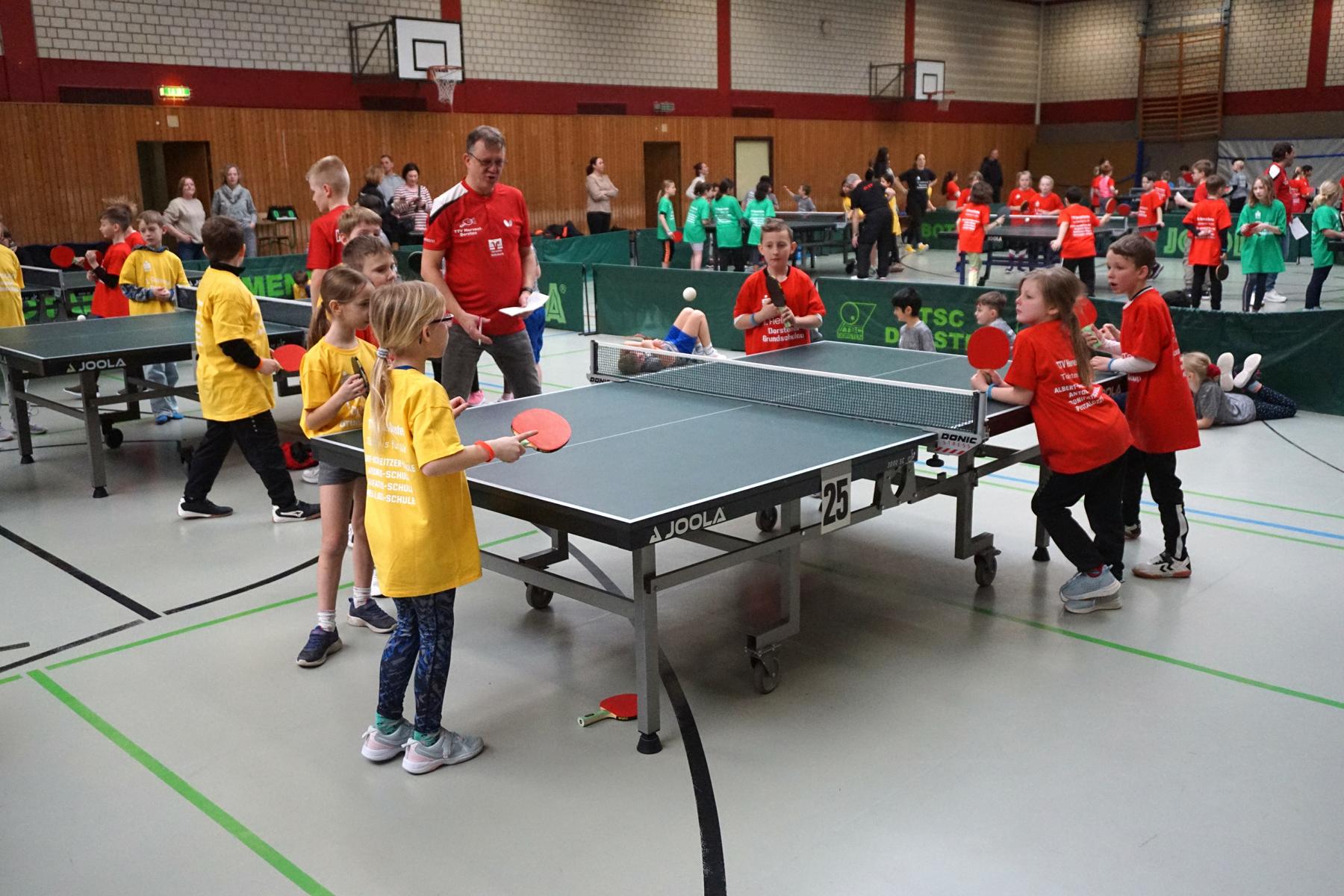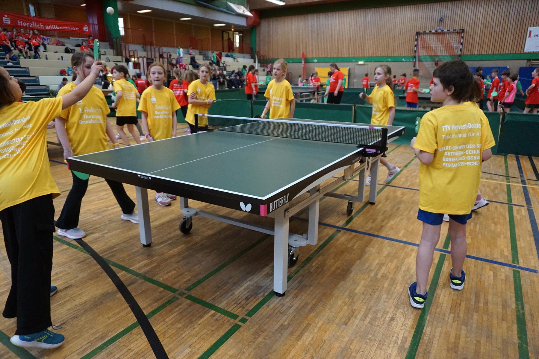 450 Kinder konnten es kaum erwarten – der erste Grundschul-Cup organisiert und durchgeführt vom TTV Hervest Dorsten stand an! Mit großer Vorfreude und Spannung machten sich die Schülerinnen und Schüler der dritten und vierten Klassen von den vier Dorstener Grundschulen, Antoniusschule, Pestalozzischule, Albert-Schweitzer-Schule und der Bonifatiusschule auf den Weg zur Halle. Dank der großartigen Unterstützung der Stadt Dorsten, die zehn Busse zur Verfügung stellte, kamen alle sicher und pünktlich an.
