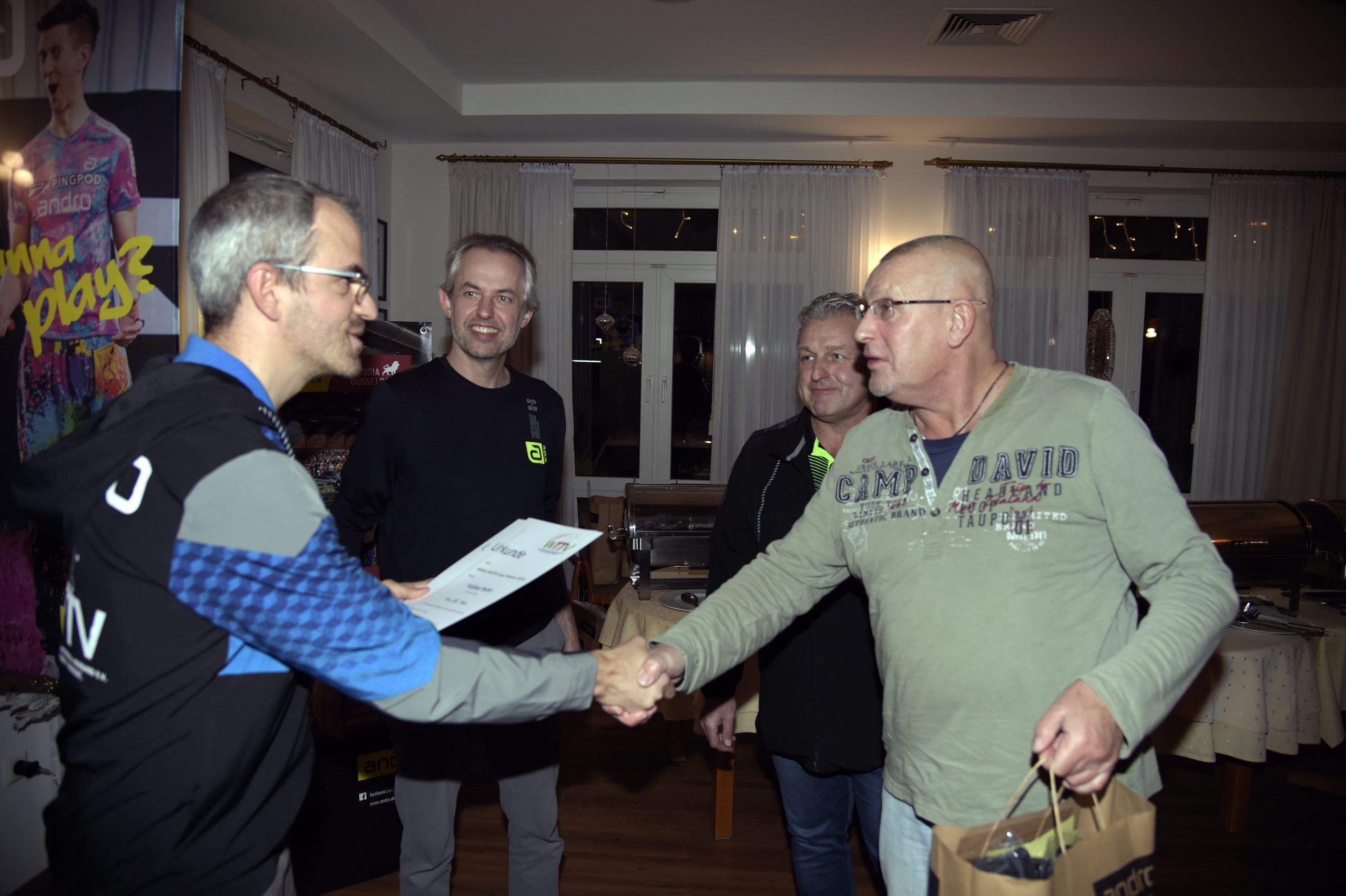 In der Gaststätte Hotel-Restaurant am Park trafen sich Sieger und Platzierte zur Übergabe von Urkunden und Präsenten. Hierzu hatten David Daus und für die Siegerehrung hat Titelsponsor andro erneut Sachpreise und Gutscheine in einem Gesamtwert von über 2.000 €uro, die an alle Finalteilnehmer/innen zur Verteilung kommen. Dazu waren eigens David Daus und Reinhardt Schmidt mit prall gefüllten Taschen nach Waltrop geeilt.