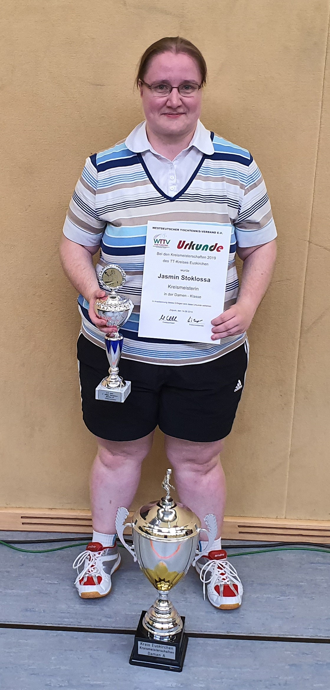 In der Damen-A-Klasse waren sieben Spielerinnen angetreten. Es siegte Jasmin Stoklossa vom TTC Lechenich vor Diana Keus vom TTV Euskirchen. Den dritten Platz belegten Ute Thelen vom TTV Lommersum und Veronica Terranova vom TTC Lechenich. Den Titel im Doppel gewannen Diana Keus und Vivian Lavis (TTV Euskirchen/TTC Lechenich).