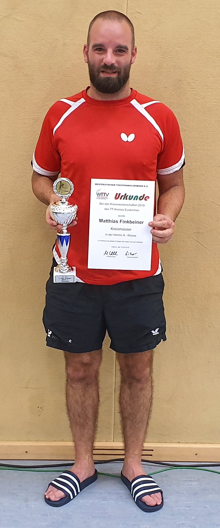 In der Herren-A-Klasse waren 18 Aktive am Start. Kreismeister wurde Matthias Finkbeiner vom TTC Lechenich, der im Finale Manuel Lesser vom TV Kuchenheim besiegte. Dritte wurden die beiden Erftstädter Tim Kaminski und Max Klink. Der Doppel-Titel ging an Adrian Azemi und Tim Kaminski von der SG Erftstadt.