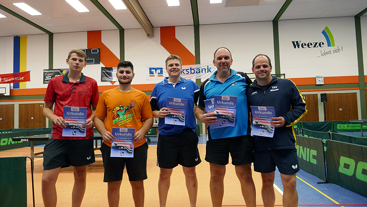 Eine tolle Performance lieferte das Team des TSV Weeze anlässlich der diesjährigen Kreismeisterschaften Niederrhein ab. Ein zügiger Turnierverlauf, hervorragernde Versorgung der Aktiven, Betreuer und Spieler und rundum gute Stimmung sorgten dafür, dass die dreitägige Veranstaltung nicht nur eine Werbung für den Verein, sondern für den Tischtennissport am Niederrherin insgesamt war,