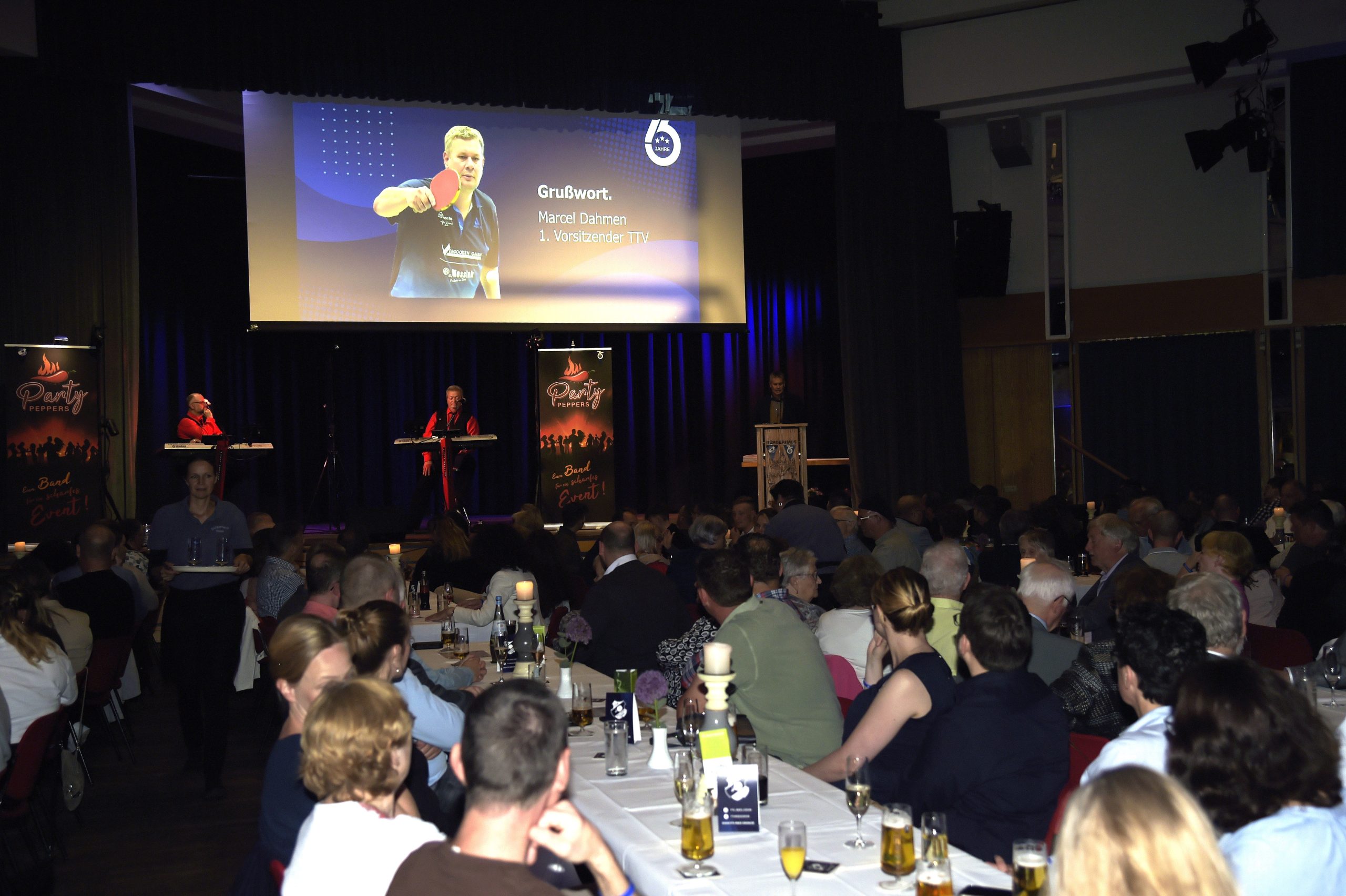 Bei der Jubiläumsfeier zeigten sich die Groiner von ihrer besten Seite. Moderator Thorben Wiedenhaupt (bekannt durch Radio KW) führte kurzweilig und eloquent durch eine rundum gelungene Jubiläumsfeier. Der Vereinsvorsitzende Marcel Dahmen leitete zunächst zum Grußwort von Helmut Joosten über, der als TTV-Mitglied gleichzeitig auch Präsident des WTTV ist und die Glückwünsche des Verbandes überbrachte. Lobende Worte für die Arbeit des TTV Rees-Groin hatte natürlich auch der Bezirksvorsitze Niederrhein, Dr. Kristian Schneider, parat und erntete dafür langanhaltenden Beifall der Festbesucher.