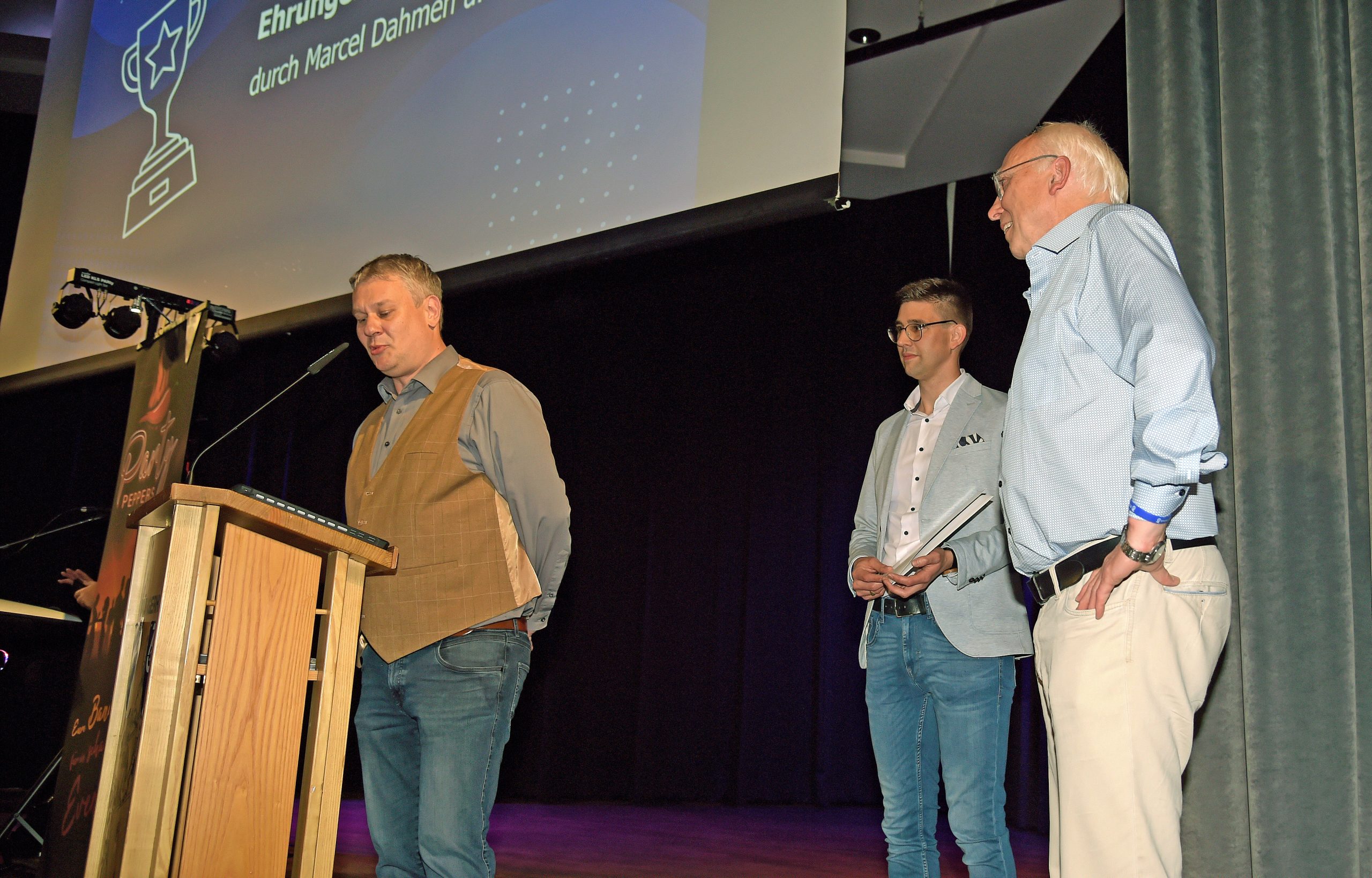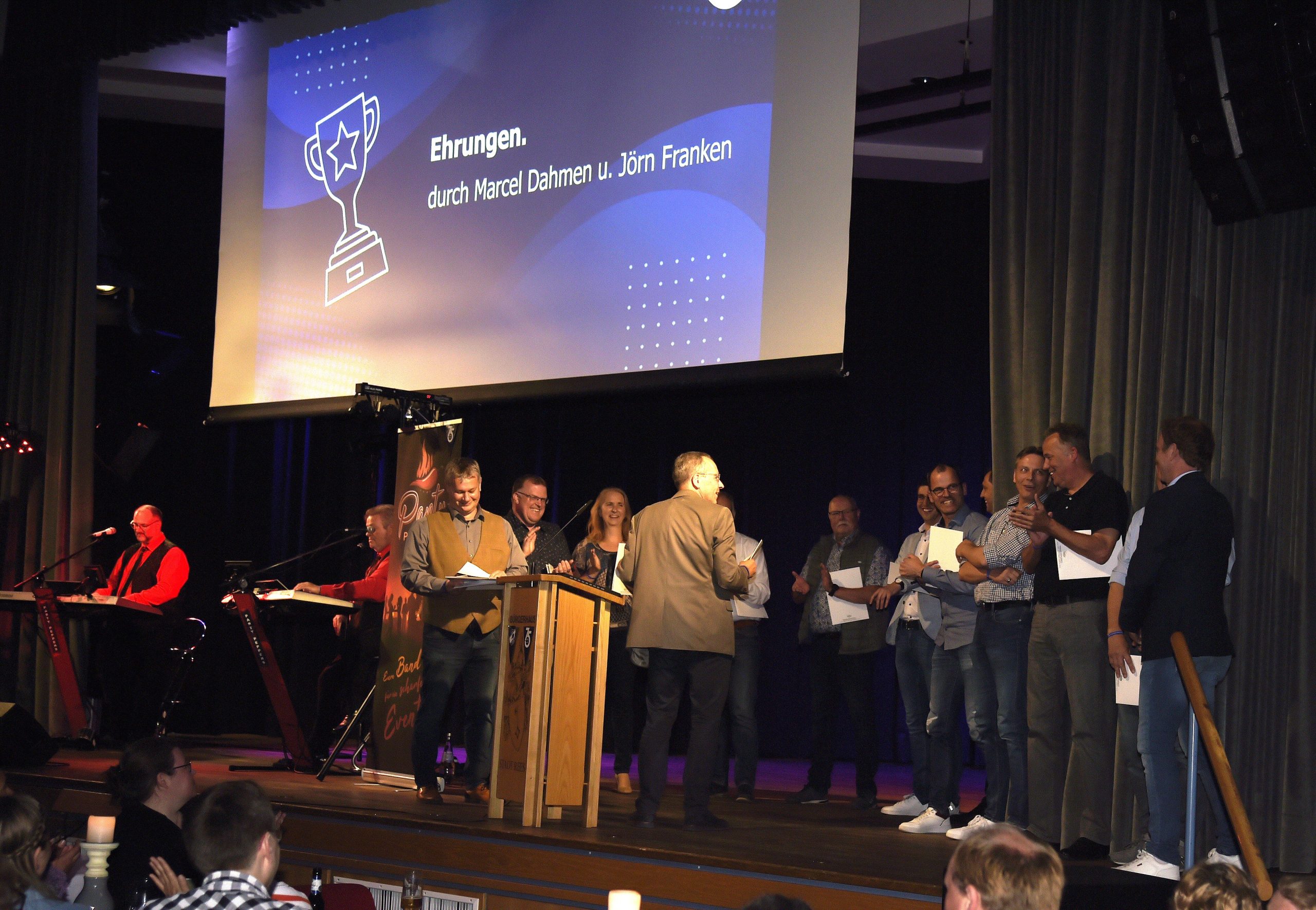 Schließlich wurde es zum Ende des offiziellen Programms nochmal feierlich, denn langjährig verdiente Vereinsmitglieder (Werner Franken, Helmut Joosten und Christian Mai) wurden für ihre unermüdliche ehrenamtliche Tätigkeit und Vereinsarbeit mit dem Ehrenpreis des TTV für besonders verdiente Mitglieder ausgezeichnet. Die Versammlung gedachte schließlich auch dem verstorbenen ehemaligen Vorsitzenden Stefan Scholten. Klaus Verburg