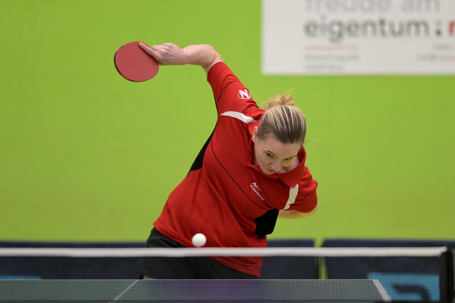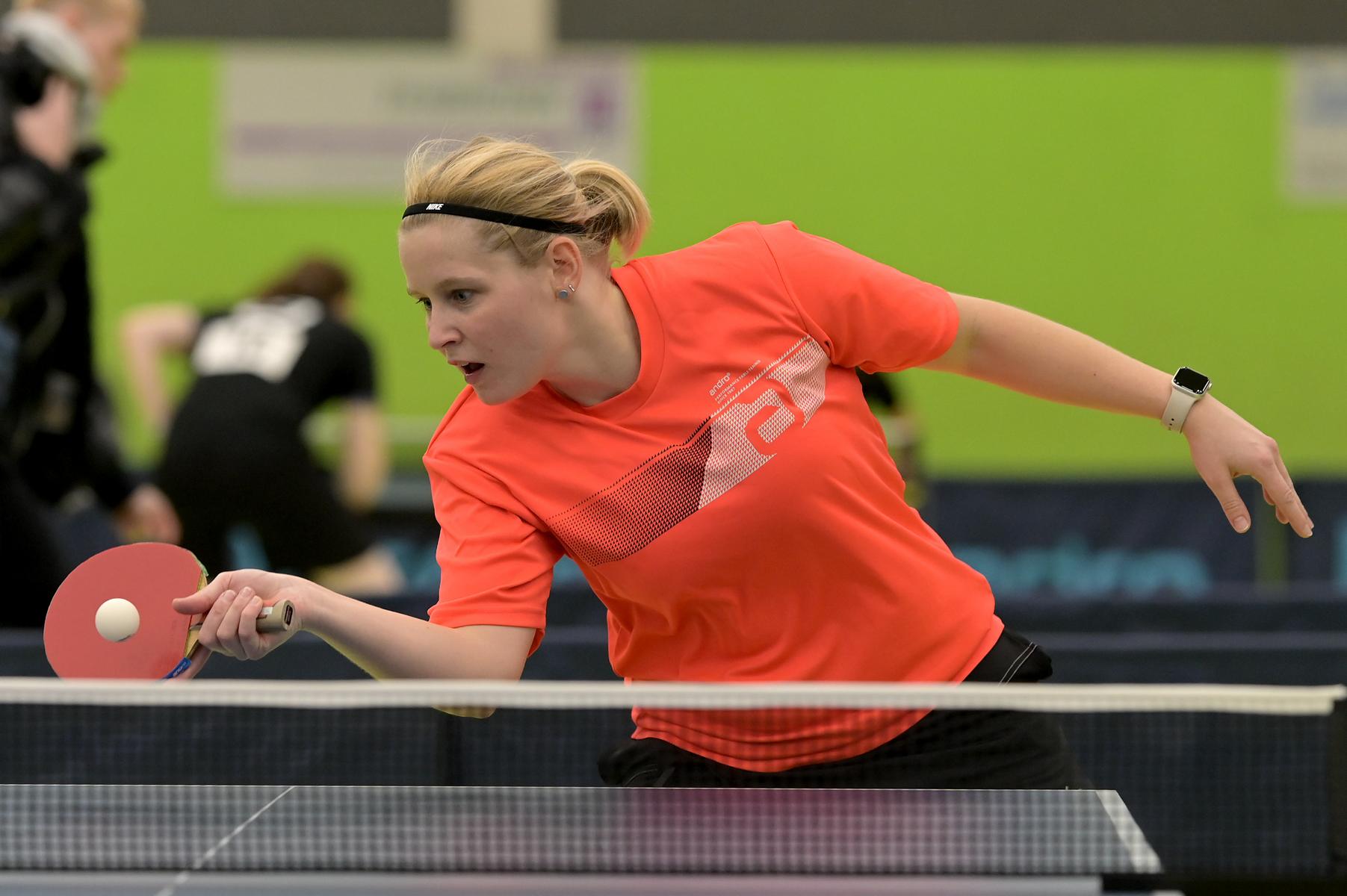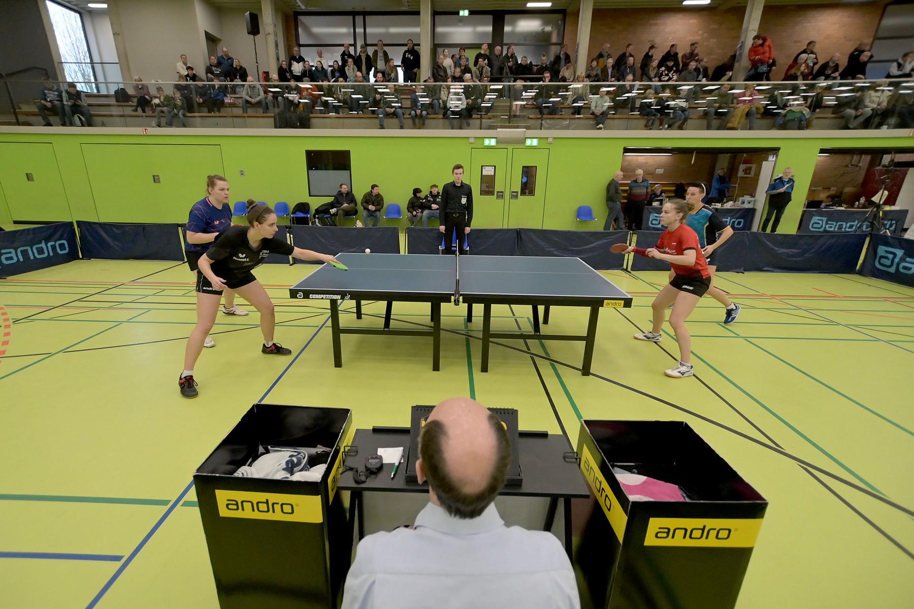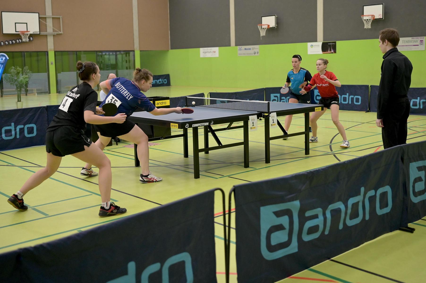 Den Doppel-Titel bei den Damen holten sich Diana Tschunichin und Hannah Schönau (1. TTC Münster mit/TTC GW Fritzdorf) 3:1 gegen Anne Sewöster und Katharina Michajlova (TSV Hahlen/PSV Oberhausen)