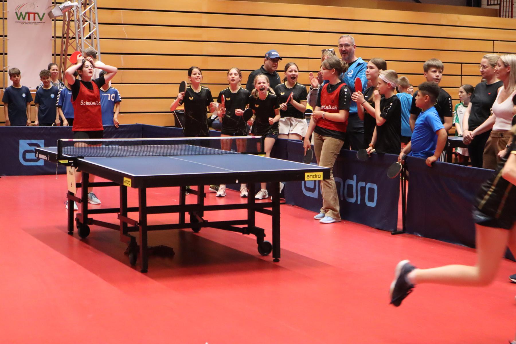 Insgesamt haben in diesem Jahr rund 600 Kinder an den verschiedenen Vorrunden und dem Landesfinale des Milchcups teilgenommen. Die Jubiläumsausgabe des Milchcups war ein echtes Highlight! Seit einem Vierteljahrhundert ist der Wettbewerb fester Bestandteil des Schullebens und hat sich zum größten Tischtennisturnier für Schulen im WTTV entwickelt. Die Stimmung im DTTZ war entsprechend ausgelassen – ob beim Anfeuern der Mitschülerinnen und Mitschüler, bei spannenden Ballwechseln an den Tischen oder beim gemeinsamen Jubel über gelungene Punkte: Die Freude am Spiel war überall spürbar.