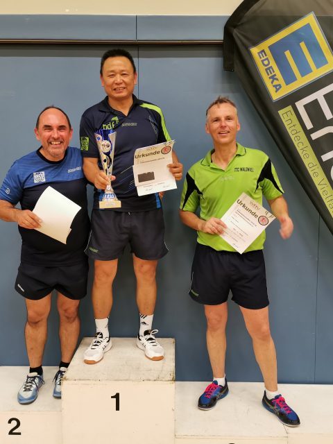 Mit neun Teilnehmern war die Senioren-50-Konkurrenz ganz ordentlich besetzt. Guangjian Zahn (TTC Waldniel) blieb bis zum Finale ohne Satzverlust, im Entscheidungsspiel traf er auf seinen Vereinskameraden Michael Poos, gegen den er 3:1 gewann und den Turniersieg klarmachte.