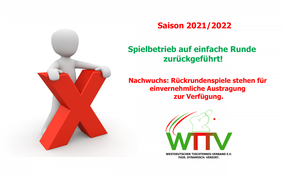 Der Vorstand für Sport des Westdeutschen Tischtennis-Verbandes hat per Umlaufverfahren am 11.02.2022 die Rückführung der Spielzeit 2021/22 auf eine einfache Runde beschlossen. Bitte beachten Sie die besondere Vorgehensweise bei der Altersgruppe Nachwuchs (Punkt 2 des Beschlusses).