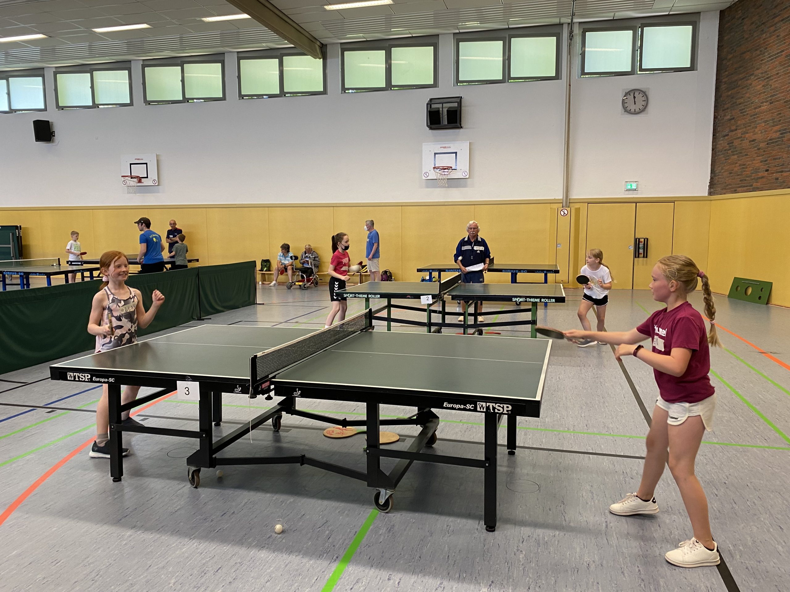 Gestartet wurde mit der sogenannten „offenen Sporthalle“ zum Ankommen, Kennenlernen und Warmwerden. Vielfältige Mitmach- und Bewegungsangebote mit dem kleinen Ball an ungewöhnlichen Plattenformen wurden für die Jüngsten aber auch für deren Eltern angeboten und intensiv genutzt. Hilfreich war dabei der Westdeutsche Tischtennisverband (WTTV), der einige der ungewöhnlichen Spielgeräte zur Verfügung stellte. Insbesondere der Tischtennisroboter war dabei den ganzen Tag über in der spielfreien Zeit eine fortwährende Attraktion für die kleinen Aktiven.
