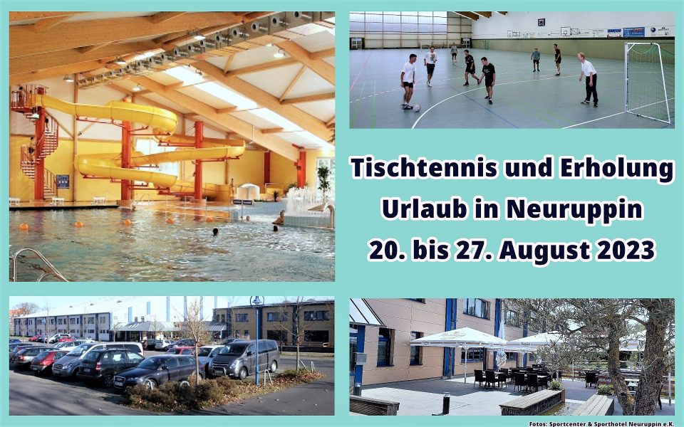 Zum ersten Mal bietet der Westdeutsche Tischtennis-Verband e.V. (WTTV) für maximal 30 Teilnehmende ein einwöchiges Urlaubsangebot vom 20. August 2023 bis zum 27. August 2023 für Erwachsene (ab 40 Jahre) als Mischung aus Tischtennis und Erholung im Sporthotel & Sportcenter Neuruppin e.K. an. Auf Anfrage können ggf. auch jüngere Teilnehmende mitfahren.