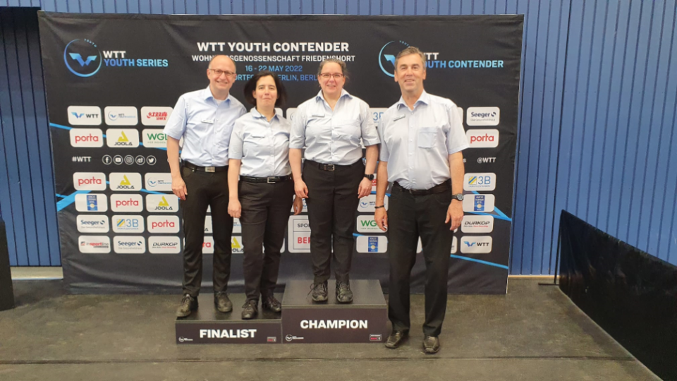 Vom 16.05.2022 – 22.05.2022 fand der erste WTT Youth Contender im Sportforum Berlin statt. Für manche Spieler:Innen des DTTB war es das erste internationale Turnier. Von den insgesamt 26 Internationalen Schiedsrichter:Innen kamen 13 Unparteiische aus verschiedenen Erdteilen und Ländern der Table Tennis World z.B. aus Bulgarien, Großbritannien, Italien, Jordanien, Portugal, Singapur, Spanien, Südkorea, Tunesien, USA und Wales. Die Freude war groß, nach der zweijährigen Pandemiezeit, die Kollegen:Innen wiederzusehen und neue Kollegen:Innen kennenzulernen. Der WTTV wurde durch den ehrenamtlichen Einsatz von Ana Beja-Pütz, Michaela Hübener, Jürgen Wernerus und Uwe Weng vertreten.