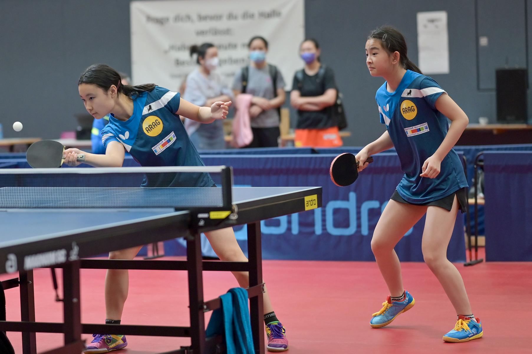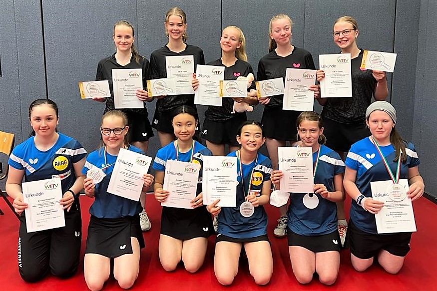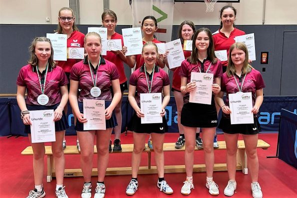 Los ging es am Samstag mit der U15-Konkurrenz. Bei den Mädchen gingen die Teams von Borussia Düsseldorf, LTV Lippstadt, TTC Mennighüffen und die DJK VfL Billerbeck an den Start. Den Titel holte sich ganz souverän Borussia Düsseldorf. Das Team mit Eireen Kalaitzidou, Rhea Zu Chen, Helene Hanke, Greta Bögershausen und Maike Bannuscher verlor in den drei Partien kein einziges Spiel, lediglich 7 Sätze und holte sich so mehr als verdient den Titel. Platz zwei ging an die LTV Lippstadt.