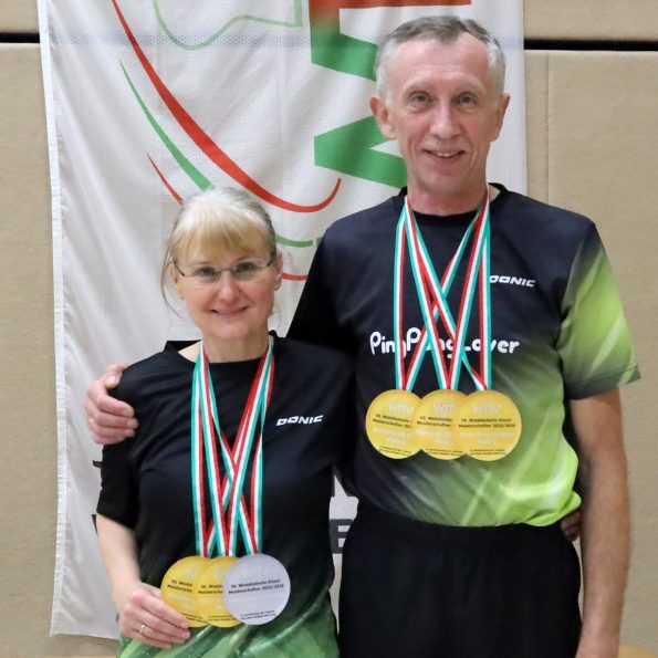 Am Wochenende wurden die Westdeutschen Einzelmeisterschaften der Senioren in den Altersklassen 40 bis 60 in Laggenbeck ausgespielt. Wieder einmal konnten die Seniorinnen und Senioren die Zuschauer mit ihren Leistungen begeistern. Der SV Cheruskia Laggenbeck bewies mit seiner Tischtennisabteilung, dass er nicht nur Weihnachtsturniere und Bezirksmeisterschaften gut ausrichten kann. So entstand in der Sporthalle am Burgweg die familiäre Atmosphäre, die Seniorenveranstaltungen häufig auszeichnet. Hier vertragen sich auch Fußballfans, wie Linda Cerkuc (Fan BVB) und Thorsten Honefeld (Fan Schalke 04) mit ihrem Sieg in der Mixed-Konkurrenz eindeutig bewiesen.